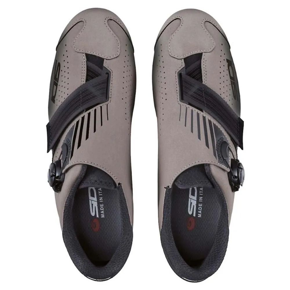 Qualidade Sidi, a cor é cinza com detalhes fluorescentes, o material é similar ao couro e parece ser muito fácil de limpar. Travas não incluídas.