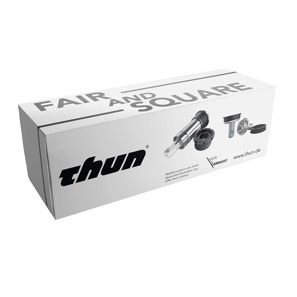 Thun Bottom Bracket ´´Efficient Jive´´ square taper, BSA thread, incl. 2 fasteníng bolts self-service package, functional shoulder (FS) left, axle made of special hardend material with (ML-hardness) in the European standard ISO 4210 (MTB standard), optimum rotation quality because of double sealed industrial bearings, zinc-coated steel sleeve to protect the bottom bracket, Durethan thread adapter, bolts with polyamide-stain cover, assemble note: shell torque: 30Nm; bolt torque: 40Nm 110 mm axle length.