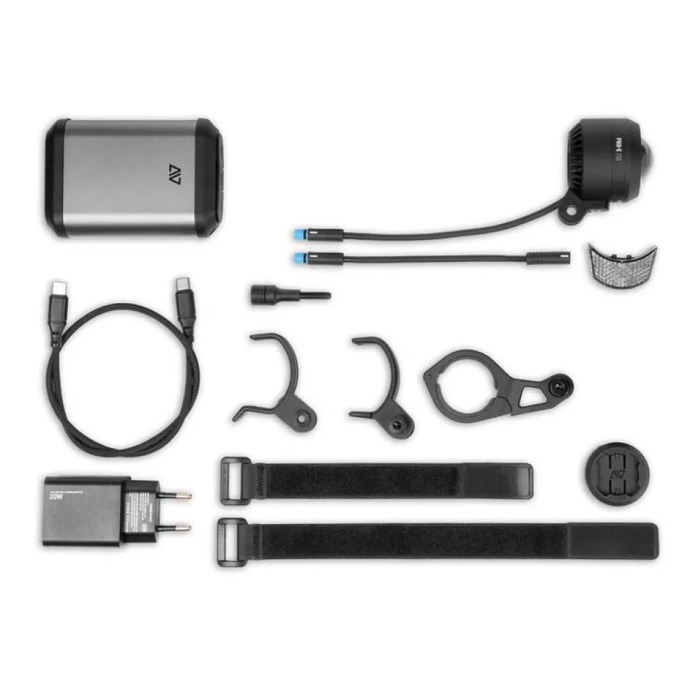 - Передняя фара PRO 150 + Power Bank 37 + Универсальный адаптер FPILink + Универсальный зажим для адаптера FPILink + Крепление на руль PRO-E 150 / 200 + Удлинительный кабель X-Connect 15 см + Зарядное устройство USB-C 20 Вт + Зарядный кабель USB-C + Крепление на руль Velcro X-Lock