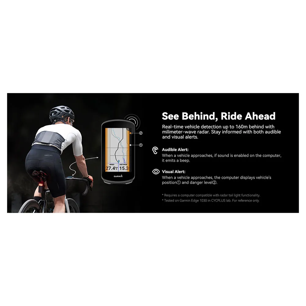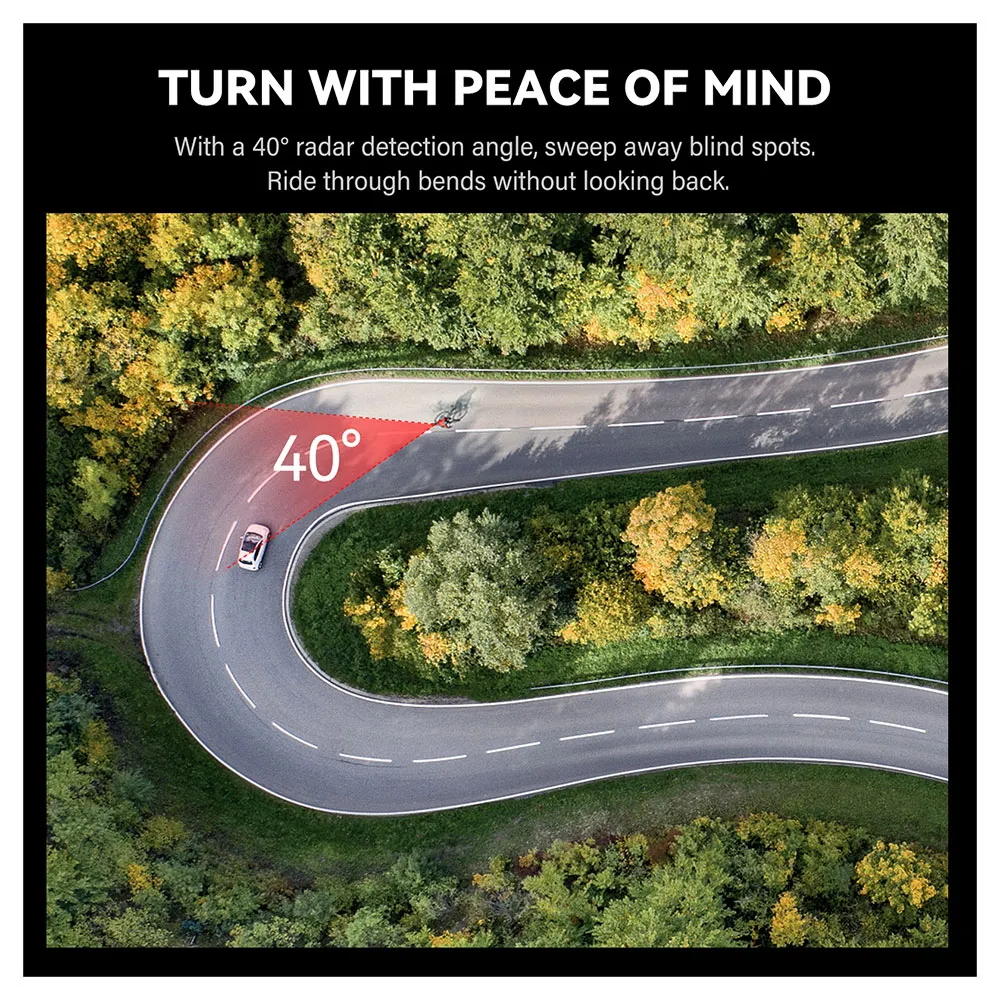 Kör med oöverträffat självförtroende med CYCPLUS L7. Dess patenterade radarteknik upptäcker närmande fordon upp till 160 meter bort och skickar visuella och hörbara varningar i realtid till din kompatibla Garmin- eller Wahoo-enhet. En ultraljus baklykta med 270° synlighet och snabba blinkande varningar säkerställer att du syns från alla vinklar. Har intelligent bromsavkänning, flera lägen inklusive Peloton, och en klassledande batteritid på 36 timmar. Allt i en kompakt, lätt (67g) och IPX6 vattentät design för ultimat trafiksäkerhet