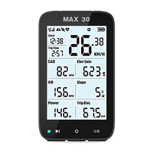 Som en ledare bland moderna cykeldatorer levererar MAX 30 exceptionellt noggrann och snabb positionering genom att utnyttja ett multi-satellitsystem, inklusive högprecisions-GPS och Glonass. Detta säkerställer tillförlitlig spårning av din hastighet, distans och rutt, även i utmanande miljöer som täta skogar eller stadskanjoner. Den stora, kristallklara 2.7-tums FSTN-skärmen erbjuder överlägsen läsbarhet i alla ljusförhållanden, från direkt solljus till skymning, och visar upp till 8 anpassningsbara datapunkter per sida så att du kan se de mätvärden som är viktigast för dig med en enda blick.