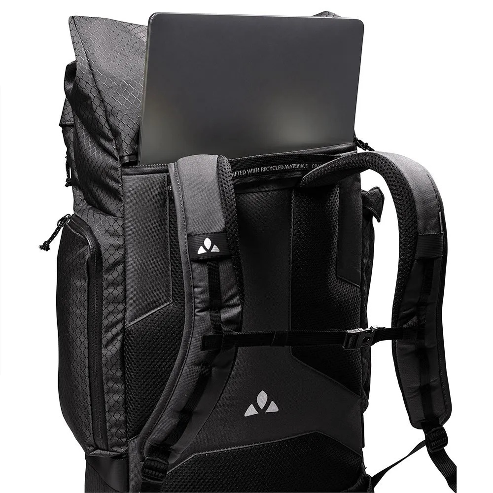 Möt din nya allt-i-ett-följeslagare: VAUDE Cyclist Pack. Denna mångsidiga cykelryggsäck i budväskestil är perfekt för pendling, fritid och resor. Dess smarta design inkluderar ett rymligt 27L huvudfack med rullstängning, en separat, blixtlåsförsedd 15.6-tums laptopficka och ett organisationsfack framtill för din surfplatta. Tillverkad huvudsakligen av återvunna material med en PFC-fri vattenavvisande yta, har den även ett integrerat regnskydd och reflekterande element för synlighet. Den ultimata blandningen av organisation, komfort och hållbarhet