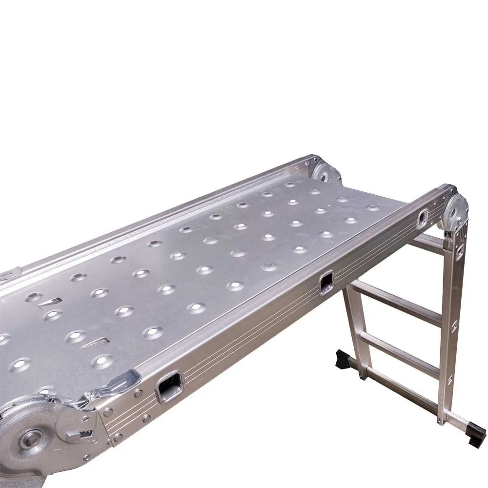 Oplev det ultimative inden for tilpasningsevne. Dette enkelte stykke udstyr transformeres ubesværet for at imødekomme de specifikke krav i dit projekt. Konfigurer den som en robust A-formet trappestige for stabil, fritstående adgang midt i et rum. Har du brug for mere højde? Konverter den hurtigt til en lang, lige forlængerstige for at nå høje lofter, tage eller vinduer. At arbejde på ujævne overflader som trapper er ikke længere en udfordring; det innovative design gør det muligt at opsætte den som en sikker trappestige, der giver en jævn og sikker platform. Til større projekter, der kræver et bredere arbejdsområde, kan den endda konfigureres som en pålidelig bukkestige eller stilladsbase, hvilket giver dig et solidt fundament at arbejde fra.