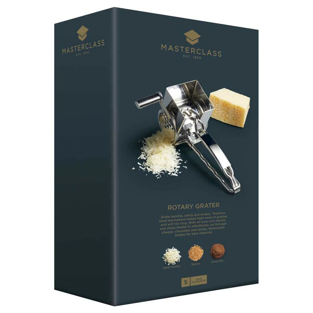 Med MasterClass Deluxe rustfrit stål roterende ostrivejern kan du nemt rive halv-hårde og hårde oste med en simpel drejning af et håndtag! Bygget af rustfrit stål af højeste kvalitet for maksimal styrke og holdbarhed, kan du stole på, at det leverer gode resultater, gang på gang.