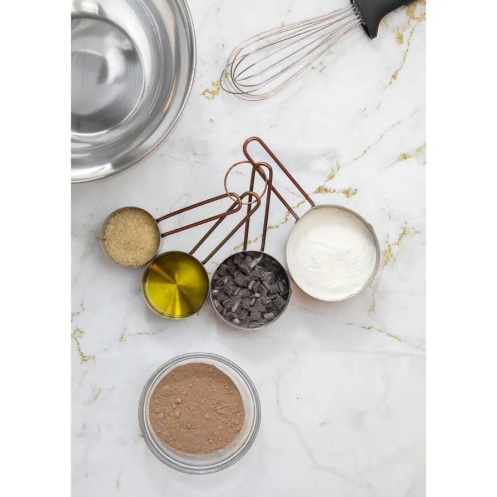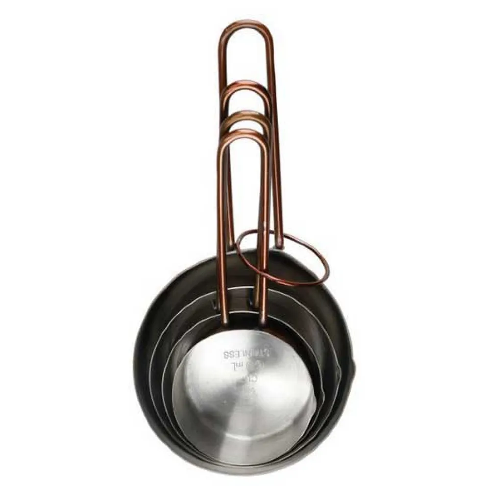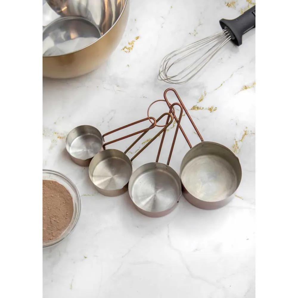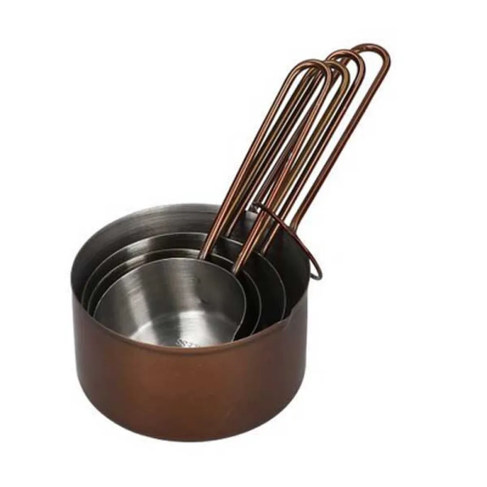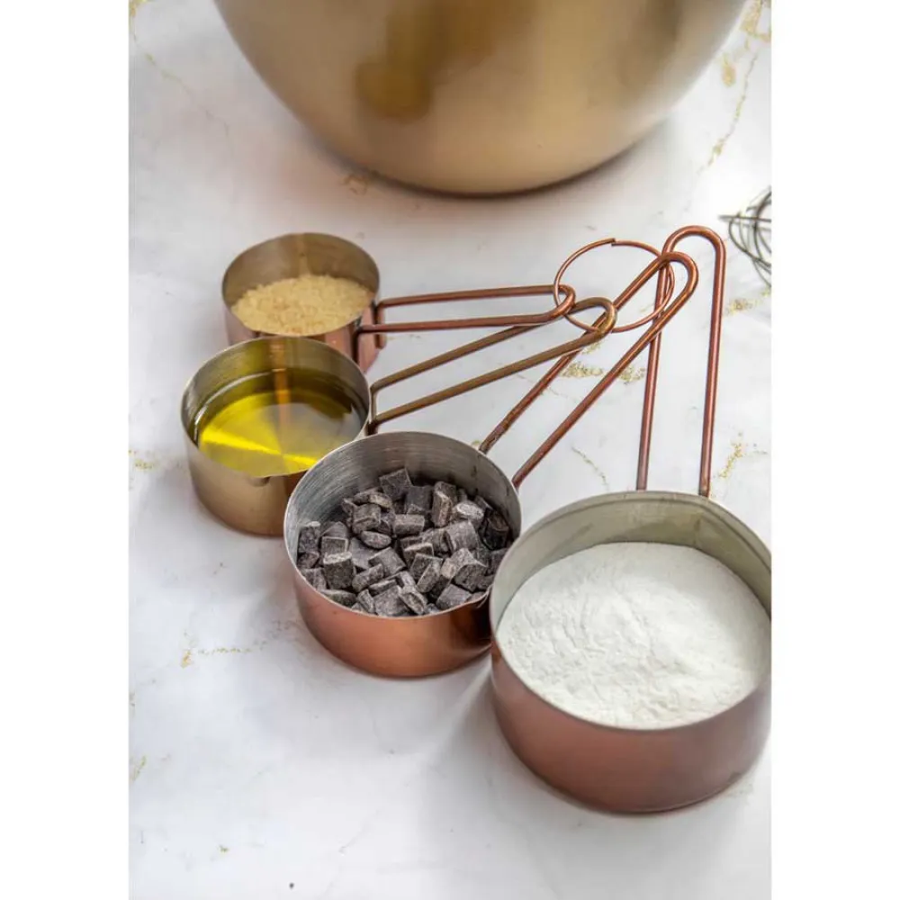 Giv din madlavning og bagning et trendy vintage-touch med disse kobberfarvede målebægre fra Master Class. Deres kombination af rustfrit stål og en skinnende kobberfinish ser fantastisk ud, og de kommer i amerikanske størrelser, så de er gode til at følge opskrifter fra USA. Du får fire målebægre i sættet, der spænder fra ¼ kop til en kop. Sammen med de matchende skeer er de alt, hvad du behøver til hurtige og nemme volumenmålinger. En rigtig tidsbesparelse! Rustfrit stål, der ikke anløber Under deres kobberydre er en kerne af fødevaregodkendt rustfrit stål af høj kvalitet. Rustfrit stål ser ikke kun godt ud, det er også lugt- og anløbsbestandigt, så det er ideelt til måling af farvede eller krydrede ingredienser. Det gør dem også nemme at rengøre uden smag eller lugtoverførsel mellem bagninger. Præcis kontrol Bægrene har indbyggede hældetuder, så du nemt kan måle væsker og hælde dem direkte i din skål eller gryde. Deres løkkede håndtag er stærke, men lette, for præcis kontrol. Praktisk opbevaringsring Disse stilfulde bægre kommer sammenbundet på en lille opbevaringsring. Udover at sikre, at de forbliver pænt sammen, giver det dig mulighed for at hænge dem op på en redskabsholder eller krog. Bægrene kan også stables, hvilket er rigtig praktisk til opbevaring i en skuffe.
