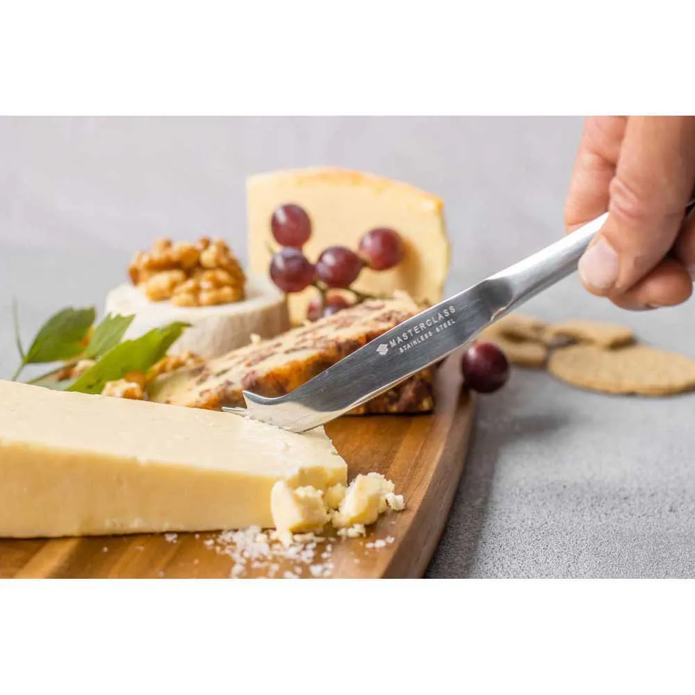 Med MasterClass Rustfrit Stål Ost Kniv kan du nemt skære skiver af hård og halvhård ost som gruyere, gouda og cheddar. Dens højkvalitets rustfrit stålkonstruktion betyder, at den er mere end stærk nok til almindelig brug - så den er ideel til ægte ostelskere. Kniven har en skarp savtakket kant, som gør det hurtigt og nemt at skære ost direkte fra køleskabet. Når du har skåret en skive, kan du tage den op med knivens to-tands top til servering. Et fantastisk stykke at have, hvis du er vært for en middagsfest, dens spejlpolerede finish vil helt sikkert imponere dine gæster under din formelle osteret. Og selvfølgelig er det også perfekt til hurtige snacks af ost og kiks.