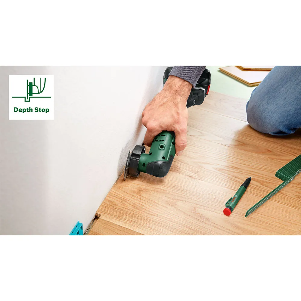 A 4-stage depth stop controls the cutting depth. A wide range of Starlock accessories available for sanding, cutting, etc.