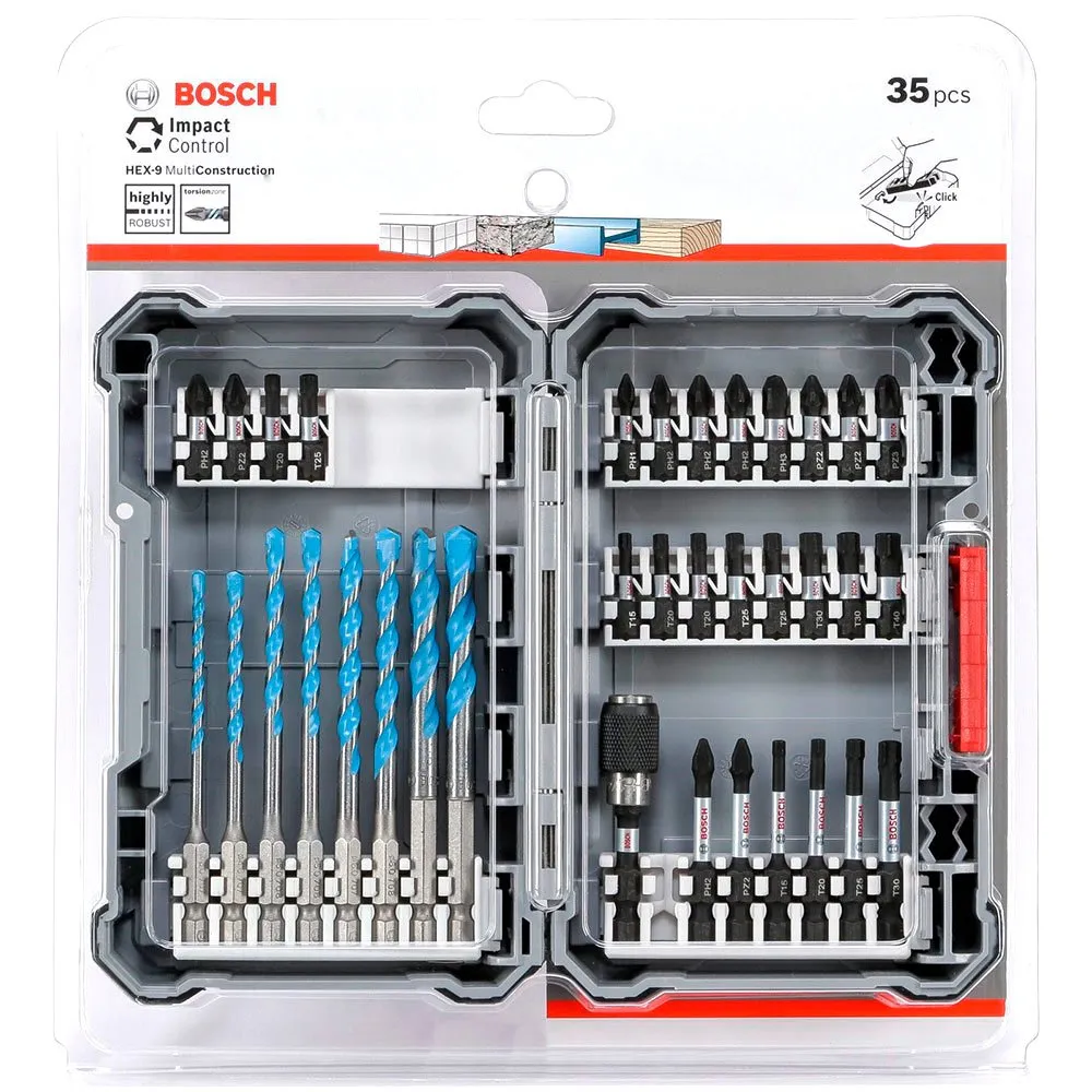 Bosch Impact Control Screwdriver Bit Sets, 35-Piece. Number of bits: 35 pc(s), Material: Steel, Certification: CE. Shank size: 25.4 / 4 mm (1 / 4´´), Shank shape: Hexagonal, Case material: ABS