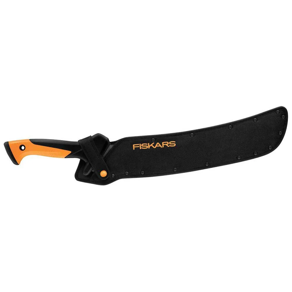 Unleash power and speed on overgrown vegetation with the FISKARS Solid Machete. Engineered for clearing large areas, its 15” ultra-sharp, hardened steel blade makes quick work of thick brush and branches. The specially curved blade profile prevents binding in dense growth, while a low-friction coating ensures smooth cuts. Its versatile Softgrip® handle offers multiple grip options for precision control or maximum force, all with one hand. This frees your other hand for stacking clippings, speeding up your work. Includes a nylon carry case for safe transport and storage