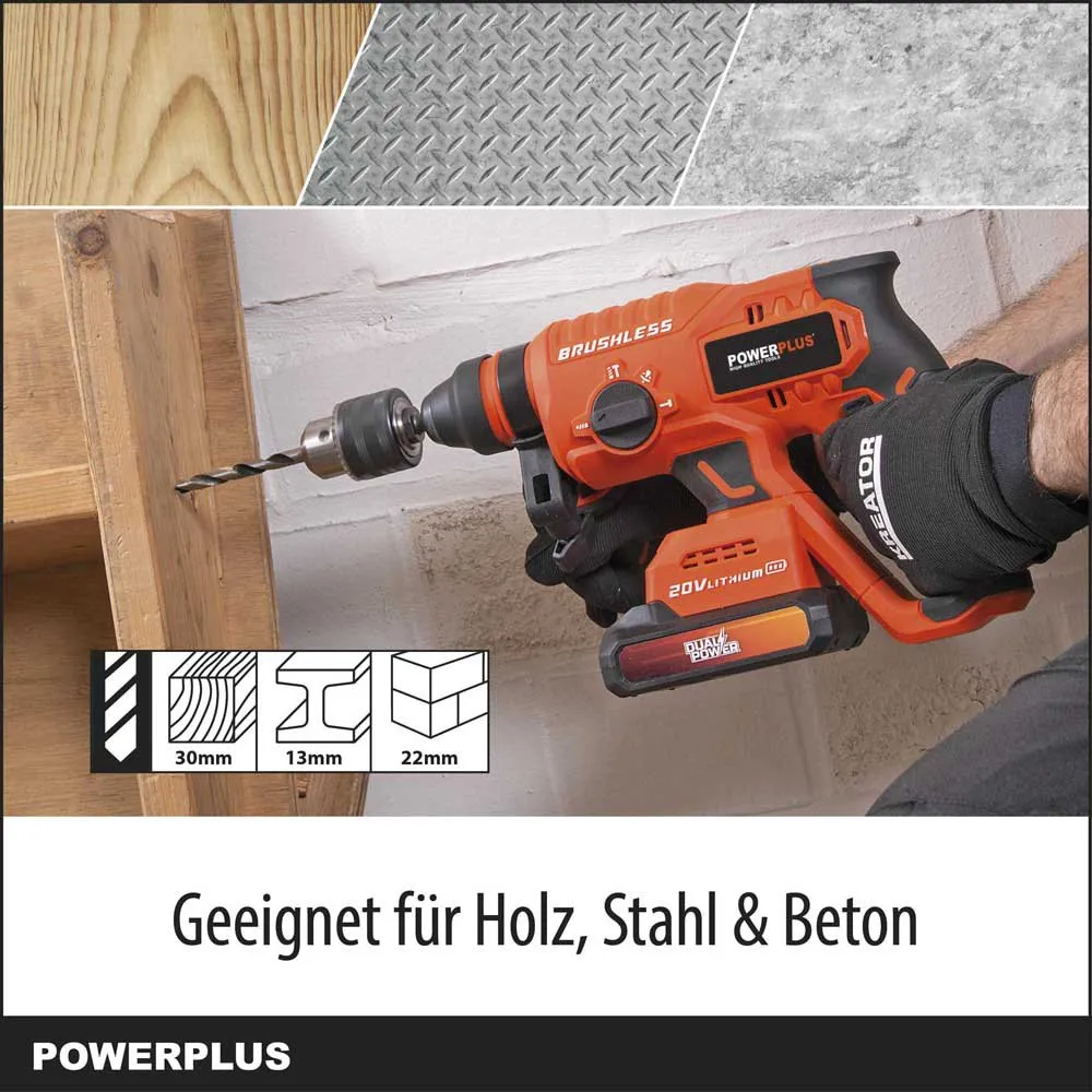You can use this POWERPLUS POWDP15630 20V cordless combination hammer for drilling, hammer drilling and chipping in wood, stone, steel or brick. Thanks to the efficient brushless motor, the tool is extremely durable and provides an impact force of 3 J. It can be used for drilling in harder materials as well as for light chopping. Comfortable work is guaranteed thanks to a low level of vibration and a soft grip that fits perfectly in your hand. Thanks to the practical work light, working in dark spaces is no problem, and the dust cover protects your machine from contamination. Three drill bits and a flat and pointed chisel are included, so you can get to work right away. You can use batteries from the DUAL POWER series with a voltage of 20V as well as batteries with a voltage of 40V. We recommend using a 40V battery that offers you optimal operating time.