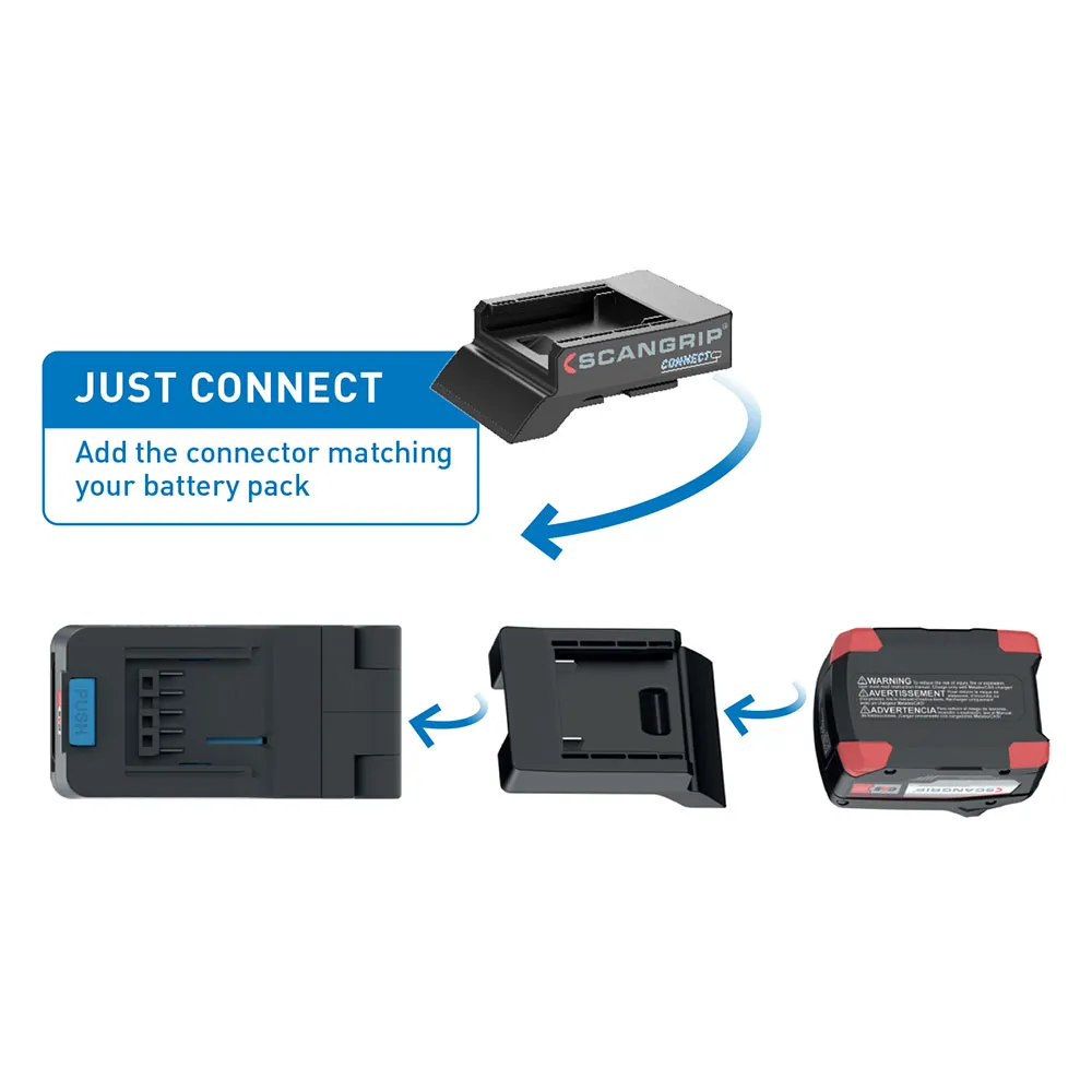Experience true freedom and convenience with the revolutionary SCANGRIP CONNECT system. This spotlight is designed to be compatible with主流 18V/20V battery packs from leading power tool brands by using the appropriate connector. This groundbreaking feature means you can power your SCANGRIP light with the same batteries you already use for your drills, saws, and other cordless tools. Eliminate the need for multiple chargers and battery systems, streamlining your kit and saving valuable time and money. It’s the ultimate cross-brand solution for professional lighting.