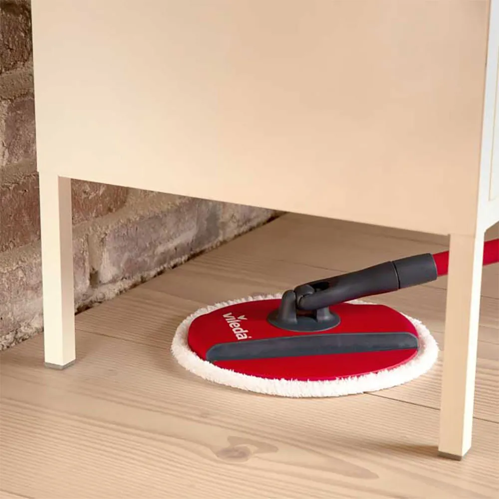 rotary mop spin & clean vileda. with this new system with roller cleaning. the mop remains clean during the whole scrubbing process. the bucket contains a roller which rinses and thoroughly cleans the mop during rotation. dirt and hair will no longer stick to the mop and it will always be ready to clean. easy to use, ergonomic design. the mop can be washed by hand and also by machine, up to 60º. the kit consists of a handle, a head and a rotating hub.