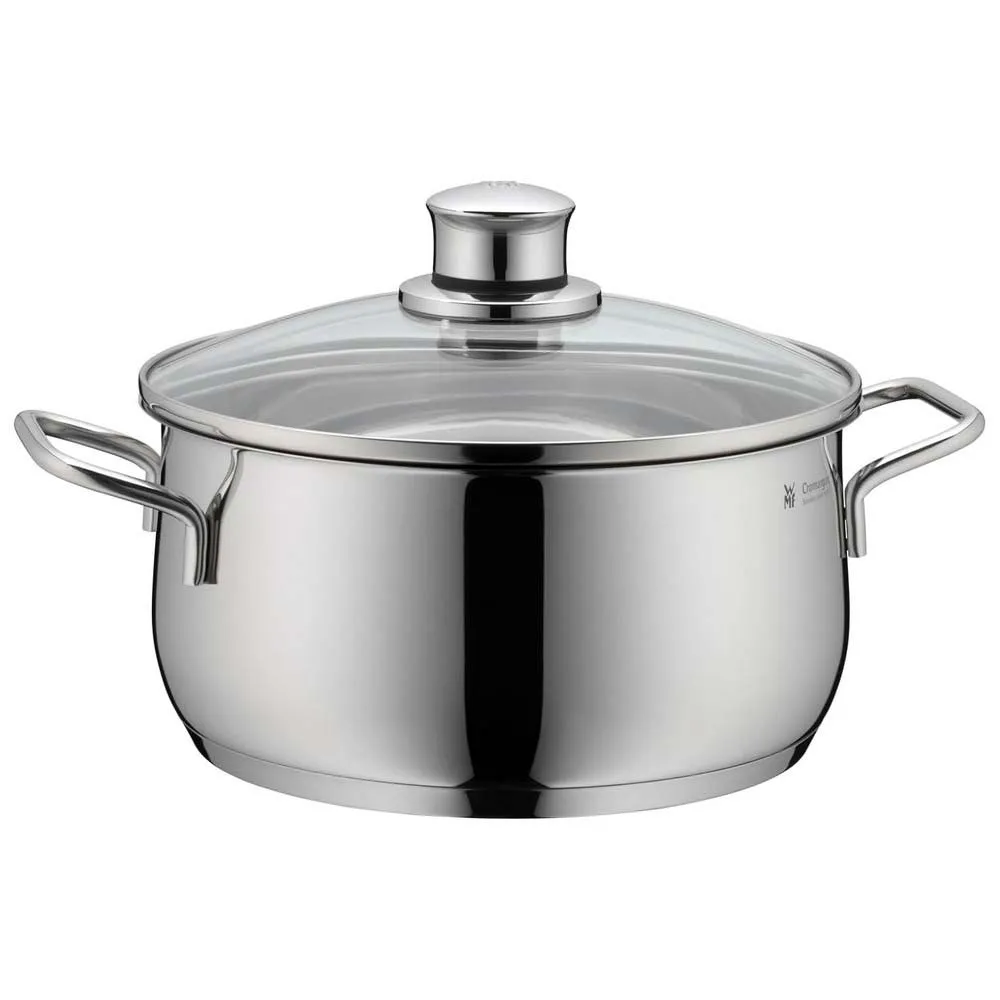Exceptional cookware and kitchen tools that combine performance with aesthetics: The WMF Diadem Plus Cookware Set adds a touch of refinement to your home cooking, with elegant design and high-quality results every day. Our premium cookware boasts outstanding durability, expertly crafted from high-quality Cromargan®: stainless steel 18/10: dishwasher safe, acid-resistant and oven-proof up to 200 °C (lid up to 130°C), ensuring full flavor and performance that´s built to last. Discover outstanding pots and pans that bring together convenient features like easy-pouring wide rims, exquisite design with graceful curves, stylish knob handles, and a sleek chrome aesthetic for timeless elegance day after day. This starter set offers everything you need for a fully equipped kitchen: Braising pan 20cm with elegant glass lid, soup pots 16/20/24cm with elegant glass lids, saucepan 16cm. When it comes to good pots, the most important consideration is their thermal behavior. And because aluminum conducts heat quickly and distributes it evenly, WMF pots feature the TransTherm®-universal base, consisting of a thick aluminum core encapsulated in a chromium steel exterior. This protects the aluminum core from aggressive detergents and prevents food residue from sticking to the outside of the pot, making it easy to clean. The TransTherm®-universal base is suitable for all types of stove, including induction hobs, as the chromium steel used in the capsule is magnetic. For optimum energy efficiency, the pot and hotplate should be approximately the same diameter. Pots with the TransTherm®-universal base are extremely energy efficient. The base is cambered during manufacture, giving it a slight inward curvature. When the pot heats up, the base expands so that it is on a level with the hotplate. This guarantees its stability and prevents energy loss. The thickness of the base determines the amount of heat that is conducted and stored. The TransTherm®-universal base is the ideal thickness to ensure the perfect balance between thermal storage and heat conduction. The residual heat stored keeps food warm for longer.