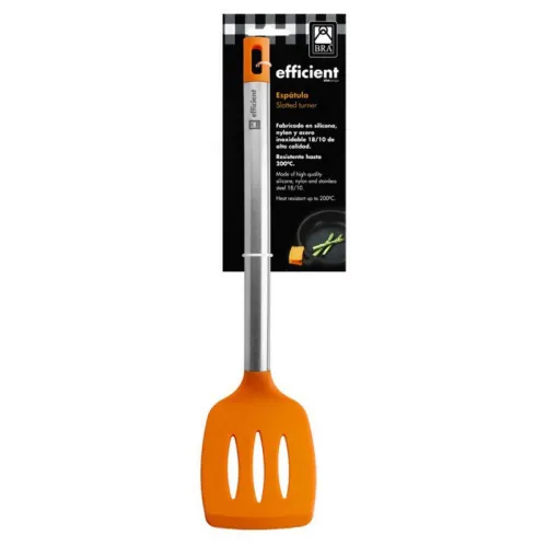 Espátula de la serie Efficient ideal para todo tipo de ollas, cazuelas o sartenes gracias a sus materiales de nylon y silicona de alta calidad, protegiendo el pantalón de arañazos. Como todos los utensilios de la serie Efficient, viene con un mango de acero inoxidable 18/10 muy higiénico y resistente al desgaste. Características Fabricado en nailon y silicona de alta calidad con el característico color naranja de la serie Efficient. Mango de acero inoxidable 18/10, ergonómico y de gran resistencia al desgaste. Resistente hasta 200ºC. Fácil de limpiar y apto para lavavajillas. 36,5 cm de largo