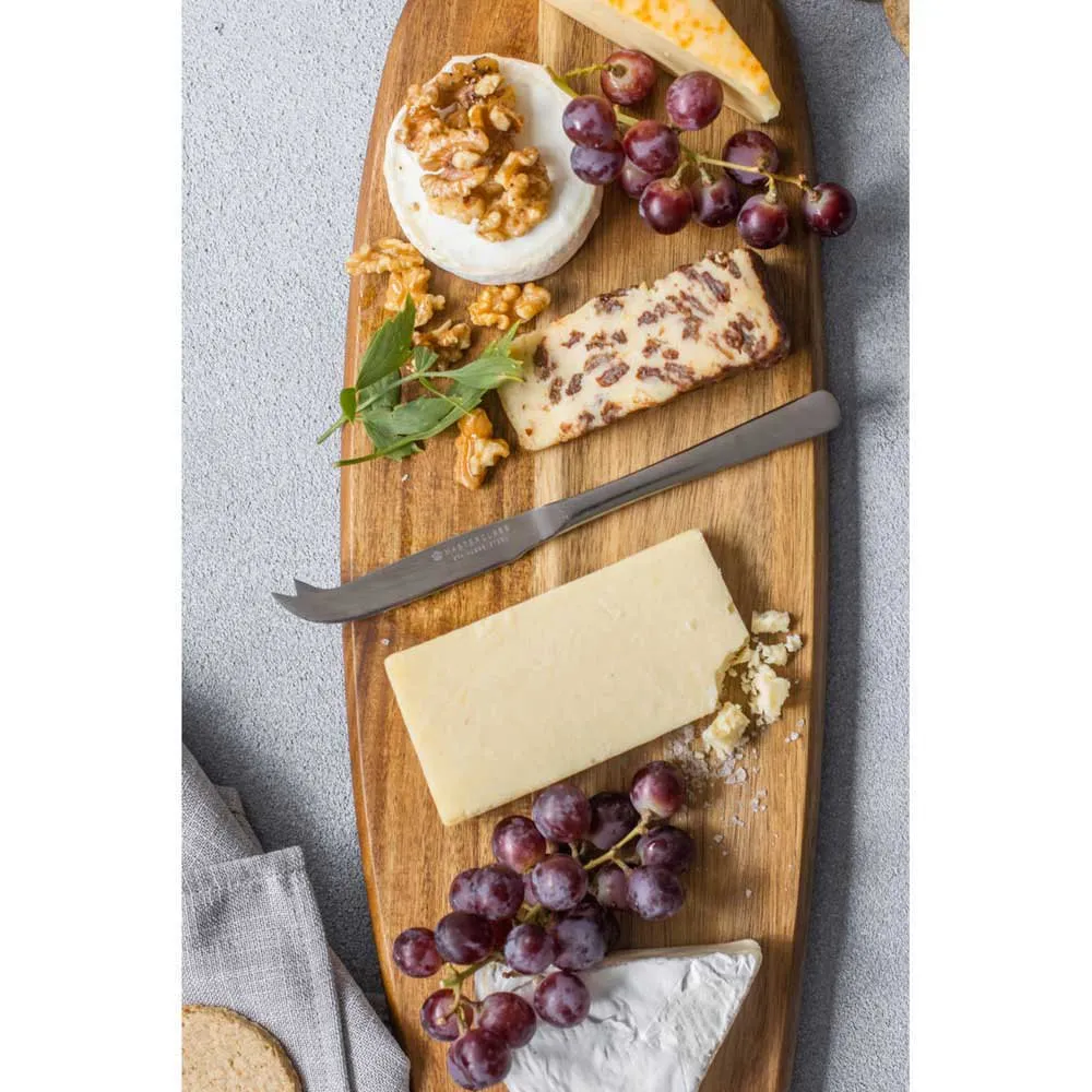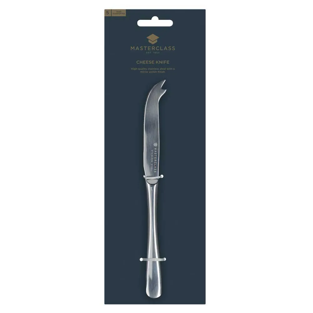 Con el cuchillo para queso de acero inoxidable MasterClass puede cortar fácilmente rebanadas de queso duro y semiduro como gruyère, gouda y cheddar. Su construcción de acero inoxidable de alta calidad significa que es más que lo suficientemente fuerte para un uso regular, por lo que es ideal para los verdaderos aficionados al queso. El cuchillo tiene un borde dentado afilado, que hace que cortar quesos directamente del refrigerador sea rápido y fácil. Cuando haya cortado una rebanada, puede levantarla con la parte superior de dos puntas del cuchillo, para servir. Una pieza fantástica para tener si está organizando una cena, su acabado pulido a espejo seguramente impresionará a sus invitados durante su curso formal de queso. Y, por supuesto, también es ideal para bocadillos rápidos de queso y galletas.