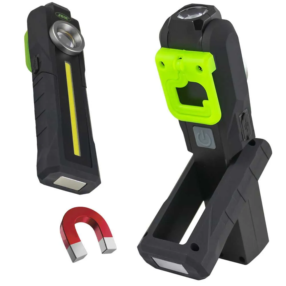Valaise mikä tahansa työtila JBM-taskulampulla. Tämä ammattimainen, ladattava LED-kohdevalo tarjoaa kirkkaan, kädet vapaana -valaistuksen missä tahansa sitä tarvitset. Sen tehokas magneettijalka ja kääntyvä koukku kiinnittyvät mihin tahansa pintaan, vapauttaen kätesi työhön. Vaihda laajan yleisvalon ja kohdistetun ylävalon välillä äärimmäisen monipuolisuuden takaamiseksi. Iskunkestäväksi rakennettu ja kätevällä USB-latauksella varustettu kestävä, kompakti tehopakkaus on välttämätön valaistustyökalu mekaanikoille, ammattilaisille ja tee-se-itse-asiantuntijoille. Tarpeeksi pieni taskuun, tarpeeksi tehokas mihin tahansa työhön