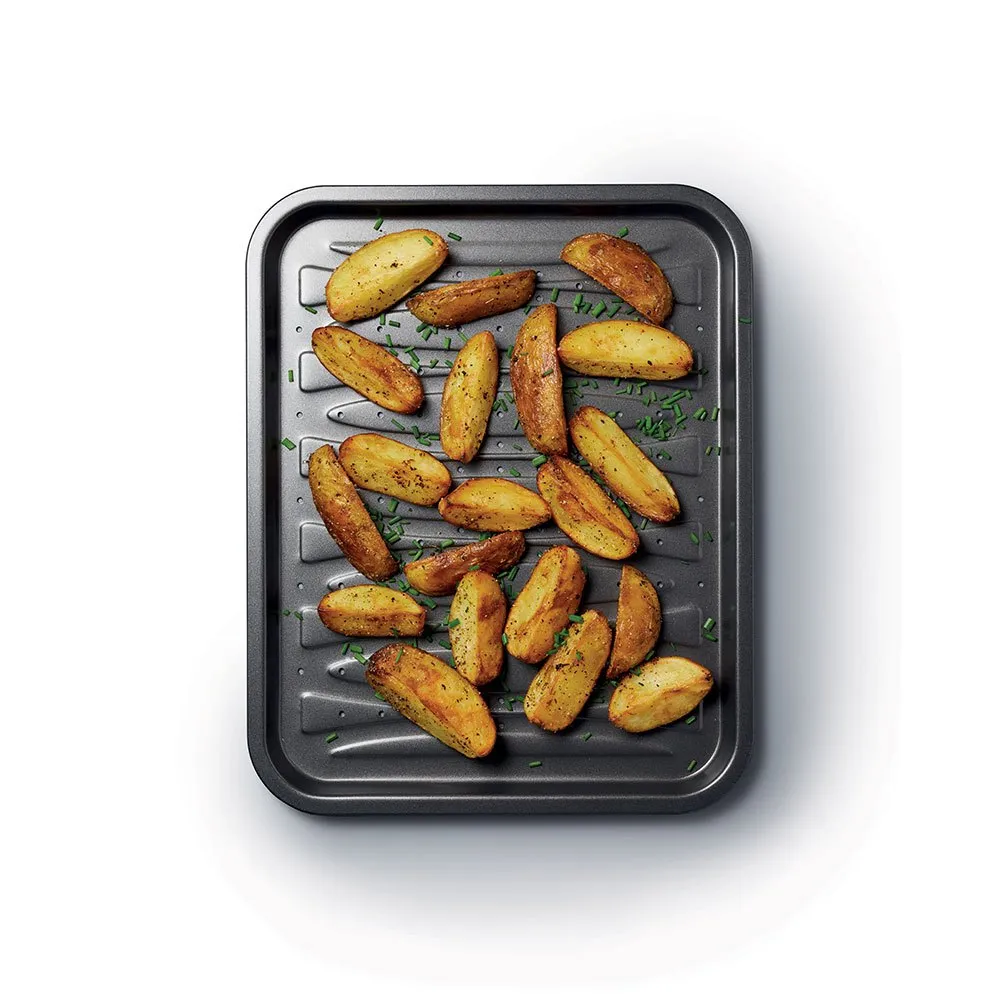Sen nerokas rei´itetty muotoilu auttaa ilmaa kiertämään ruoan ympärillä rapeamman paistotuloksen saavuttamiseksi, ja sen kaupalliset materiaalit ja tarttumaton pinnoite takaavat vuosien onnellisen leivonnan.