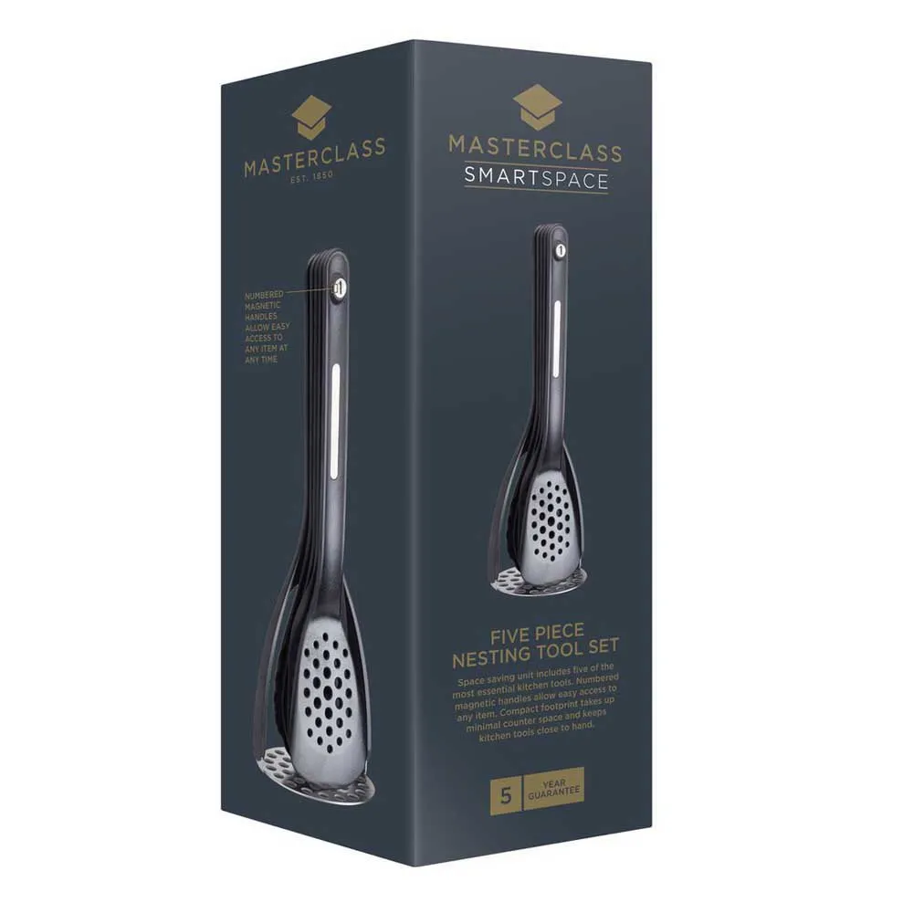 Nykyään on helppoa uppoutua keittiötuotteiden myrskyyn, ja kun jotain todella tarvitsee, sen löytäminen voi tuntua mahdottomalta. Onneksi tämä viisi kerrostettavaa keittiövälinettä sisältävä setti, joka on suunniteltu MasterClass Smart Space -keittiövälineiden sarjaan, on juuri sinulle. Tämä vapaasti seisova setti, joka hyödyntää mahdollisimman pienen jalkapinta-alan, tarjoaa tyylikkään ratkaisun tilavaikeuksiin ja pitää tärkeimmät keittiövälineesi helposti saatavilla, ilman että ne sotkevat työtasoa. Setti sisältää neljä olennaista keittiövälinettä, jotka kaikki lepäävät perunamuussaimen sisällä numeroiduilla magneettikäsineillä. Jokaisessa välineessä on pehmeästi muotoiltu kahva maksimaalisen mukavuuden takaamiseksi, ja se on valmistettu kestävistä materiaaleista, kuten nylonista, ruostumatonta terästä ja LFGB-luokan silikonia. Kuten kaikilla MasterClass Smart Space -tuotteilla, voit olla varma, että saat innovatiivisia tilaa säästäviä ratkaisuja, eikä laadusta ole tingitty.