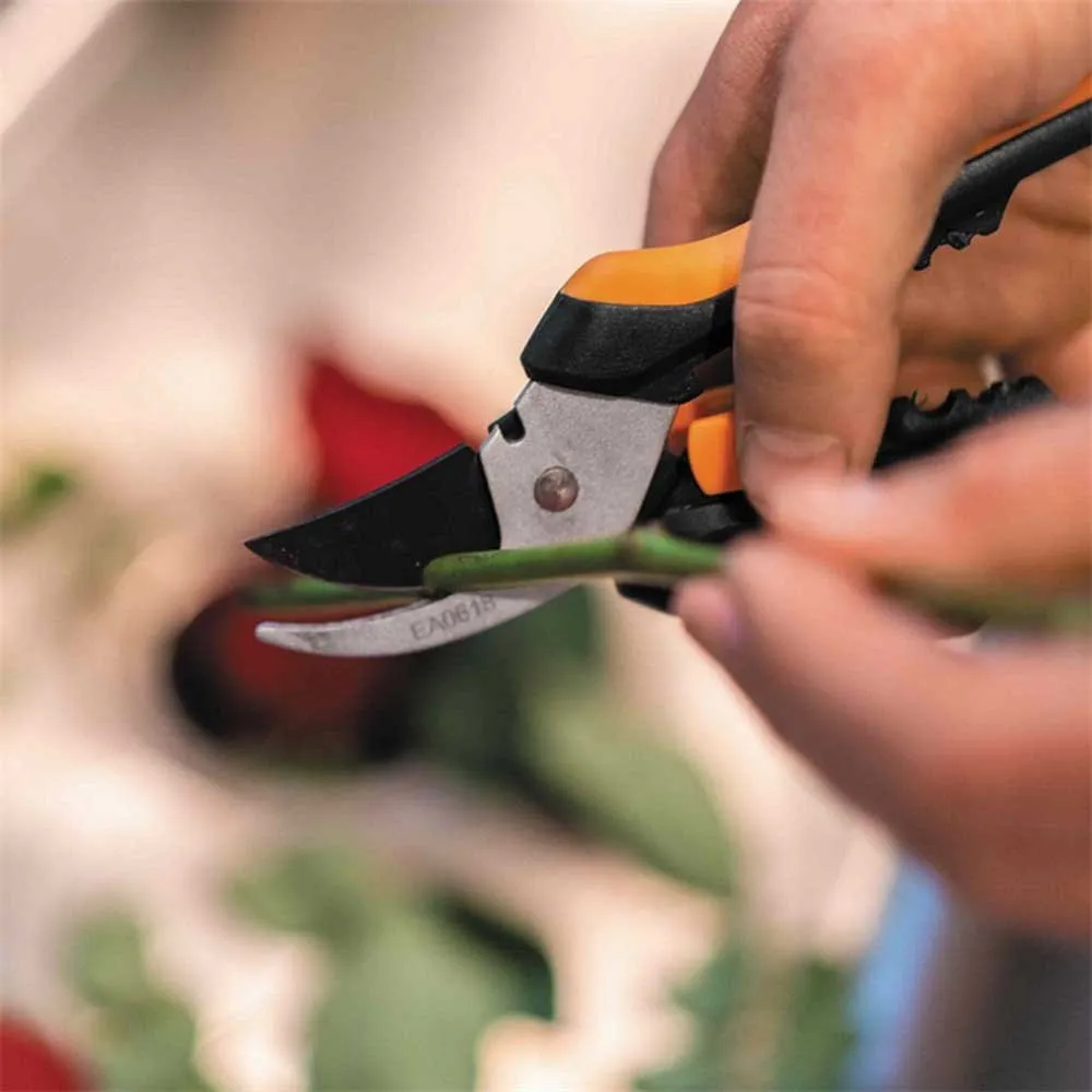 Plus petit qu'un sécateur traditionnel, mais avec plus de capacité de coupe qu'une cisaille, le sécateur floral Fiskars® est idéal pour travailler avec des fleurs coupées, ainsi que pour les tâches essentielles pour encourager une croissance saine, telles que la coupe, la taille légère et la tête morte. Le revêtement sur la lame durcie rend le sécateur durable et facile à utiliser. Les lames en acier entièrement trempées et rectifiées avec précision restent affûtées lors d'une utilisation intensive. Les points de contact Softgrip™ sur la poignée améliorent le confort et le contrôle. Les fonctionnalités supplémentaires incluent un dénudeur de tiges à utiliser avec des tiges de différentes tailles et un coupe-fil intégré.