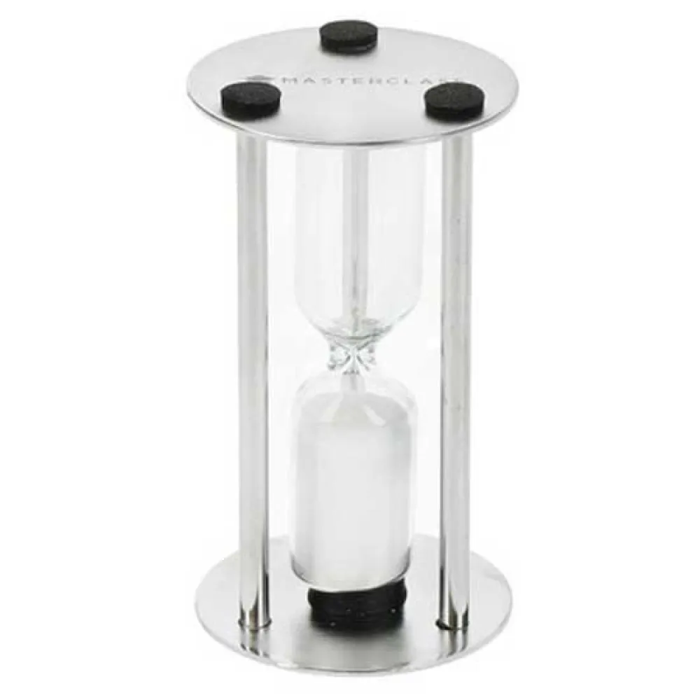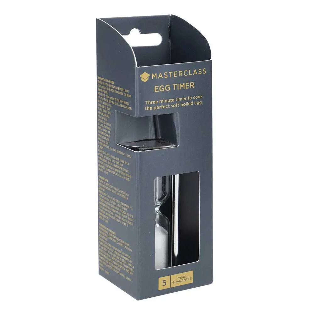 Le minuteur à sablier MasterClass de trois minutes est parfait pour tous ceux qui aiment le style accrocheur et un bon petit-déjeuner. Fabriqué en acier inoxydable robuste avec une belle finition satinée, ce sablier est conçu pour être extrêmement durable et pour trôner sur n´importe quel plan de travail de cuisine. Retournez-le et regardez son sable blanc couler vers la moitié inférieure, en chronométrant exactement trois minutes. C´est généralement le temps qu´il faut pour faire bouillir l´œuf mollet parfait. Un jaune coulant, un toast beurré croustillant et un gadget de cuisine stylé et cool, les ingrédients parfaits pour un petit-déjeuner parfait. Il est également protégé.