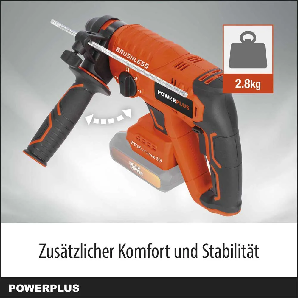Vous pouvez utiliser ce marteau combiné sans fil POWERPLUS POWDP15630 20V pour percer, percer à percussion et buriner dans le bois, la pierre, l'acier ou la brique. Grâce au moteur sans balais efficace, l'outil est extrêmement durable et fournit une force d'impact de 3 J. Il peut être utilisé pour le perçage dans des matériaux plus durs ainsi que pour le hachage léger. Un travail confortable est garanti grâce à un faible niveau de vibration et une prise en main douce qui s'adapte parfaitement à votre main. Grâce à la lampe de travail pratique, travailler dans des espaces sombres n'est pas un problème et le cache anti-poussière protège votre machine contre les salissures. Trois forets et un burin plat et pointu sont inclus, vous pouvez donc vous mettre au travail immédiatement. Vous pouvez utiliser des batteries de la série DUAL POWER avec une tension de 20V ainsi que des batteries avec une tension de 40V. Nous vous conseillons d'utiliser une batterie 40V qui vous offre une autonomie optimale.