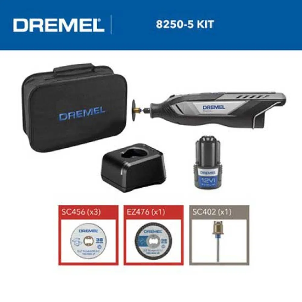 - Ti presentiamo il kit Multiutensile Dremel 8250-5, dotato di 5 accessori essenziali per dare il via ai tuoi progetti. Sono incluse 4 mole da taglio EZ SpeedClic insieme al mandrino EZ SpeedClic, che consentono cambi di accessori fino a 6 volte più veloci per un flusso di lavoro senza interruzioni. Mantieni il tuo utensile e gli accessori Dremel organizzati con la borsa portaoggetti fornita. Inoltre, con la guida rapida e la scheda informativa sugli accessori, sarai pronto per un´esperienza perfetta con il tuo nuovo Multiutensile Dremel 8250.