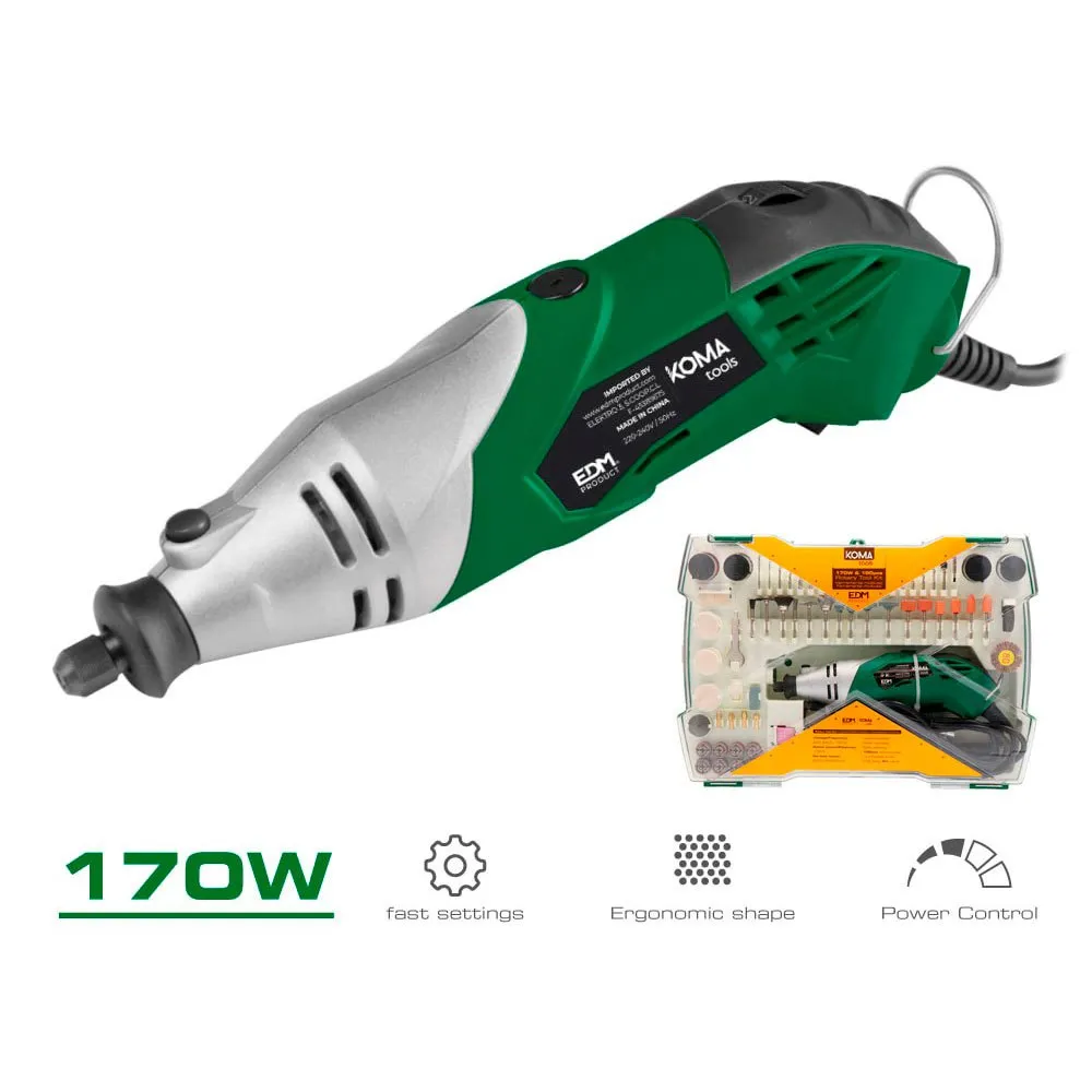 Mini utensile rotativo multiuso. potenza: 170w. 2m di cavo elettrico. velocità variabile de 8000 35000rpm. 190 accessori di intaglio, fresatura, molatura, pulitura, lucidatura. tagliare, carteggiare e incidere + 1 cavo flessibile rotante 2m. dimensioni: 23,5x7cm (fondo/alto) 220/240v 50hz utensili koma