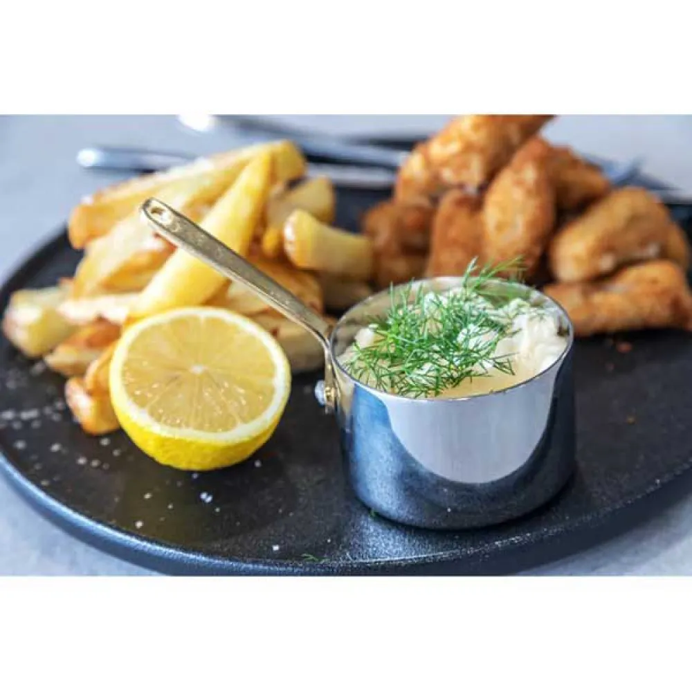 Perché non usarla per servire piselli schiacciati insieme a goujon di pesce e patatine rustiche? Oppure riempila con una salsa dolce al limone e lime per immergere la frutta? Abbastanza resistente per uso commerciale Prodotta in acciaio inossidabile di grosso spessore, questa padella è perfetta per un ambiente di cucina professionale e non mancherà di attirare l´attenzione ogni volta che viene servita.