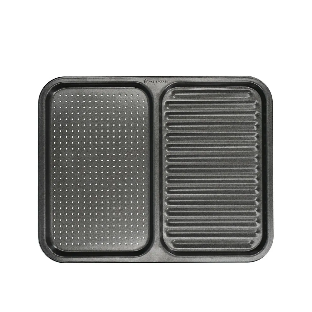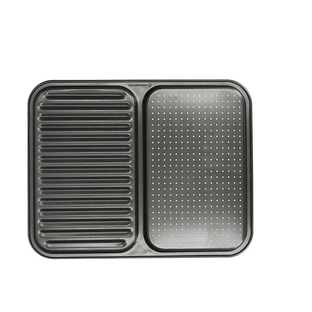 L´ingegnosa teglia è realizzata in acciaio al carbonio spesso 2 mm che consente una migliore distribuzione del calore ed è divisa in due lati, uno con piccoli fori e l´altro scanalato.