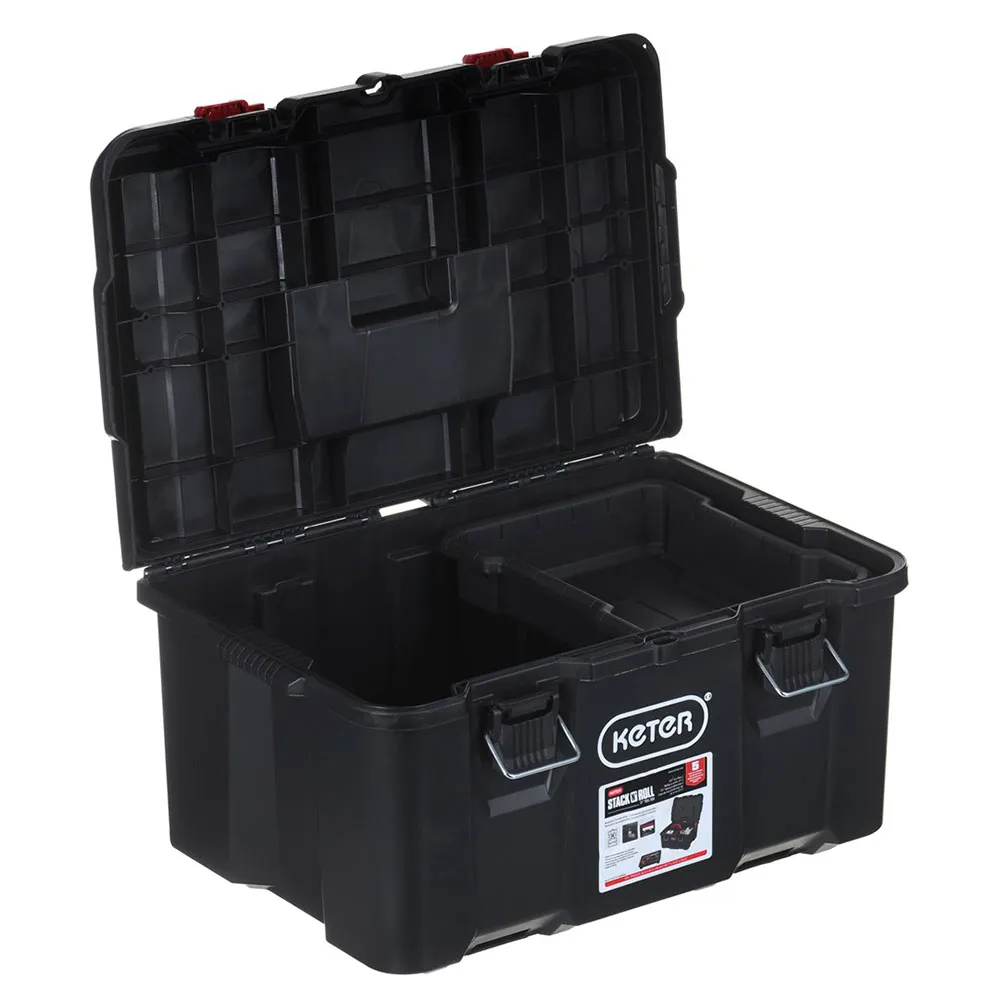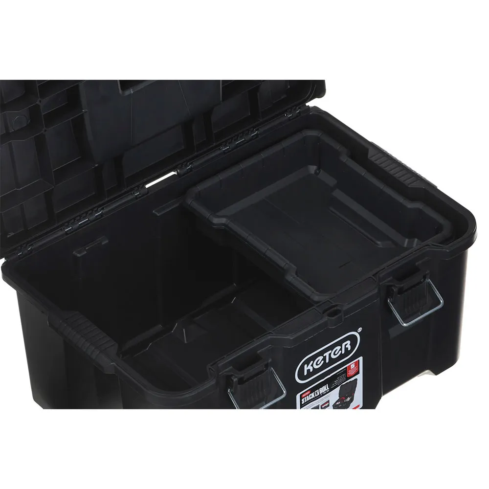 De kern van het systeem is de Stack ´n´ Roll Gereedschapskist. Deze royaal bemeten unit biedt voldoende ruimte voor een breed scala aan handgereedschap en middelgrote apparatuur. Het bevat een handige uitneembare binnenbak, waarmee u kleinere items zoals schroevendraaiers, tangen en moersleutels kunt organiseren voor snelle toegang. De gereedschapskist is beveiligd met robuuste metalen sluitingen die een zelfverzekerde, veilige sluiting bieden en uw waardevolle gereedschap beschermen tegen stof, vuil en vocht.