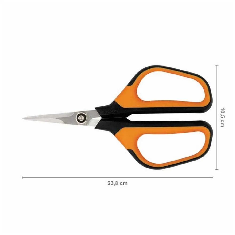 Fiskars beskjæringssaks har presise kniver som kutter helt til spissen for rene, sunne kutt på trange steder. De fullstendig herdede, presisjonsslipte knivene i rustfritt stål forblir skarpe lenger – selv ved hard bruk. Softgrip™-berøringspunktene på håndtaket forbedrer komforten og kontrollen, og håndtakets design passer til både venstre- og høyrehendte brukere. Beskjæreren er ideell for intrikate kutt på planter og blomster mens du trimmer og former.
