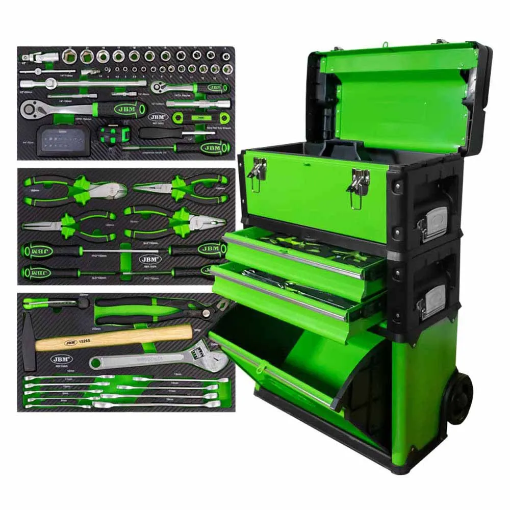 Kjernestyrken til JBM Modular Cart ligger i dens eksepsjonelle allsidighet. Dette er ikke bare en enkelt verktøykasse; det er et fullt tilpassbart system bestående av tre distinkte, sammenlåsende moduler som kan konfigureres for å møte de spesifikke kravene til enhver oppgave. Stable, separer og omorganiser enhetene enkelt for å skape den perfekte mobile arbeidsstasjonen. Trenger du en lett, lett tilgjengelig boks for en rask reparasjon? Bare ta av toppmodulen. Krever du hele arsenalet ditt for et komplekst prosjekt? Lås alle tre enhetene sammen for et komplett, rullende verktøytårn. Denne tilpasningsevnen sikrer at du bare bærer det du trenger, effektiviserer arbeidsflyten og reduserer unødvendig vekt.