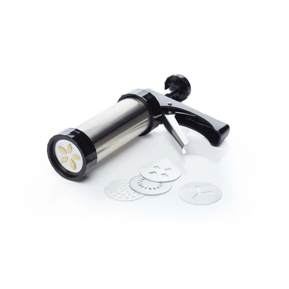 I tillegg fungerer det med nesten alle kjeks- eller kjeksoppskrifter! Sprøytepistolen har en justerbar avtrekkerdyse, slik at du har full kontroll over de søte godbitene du lager.