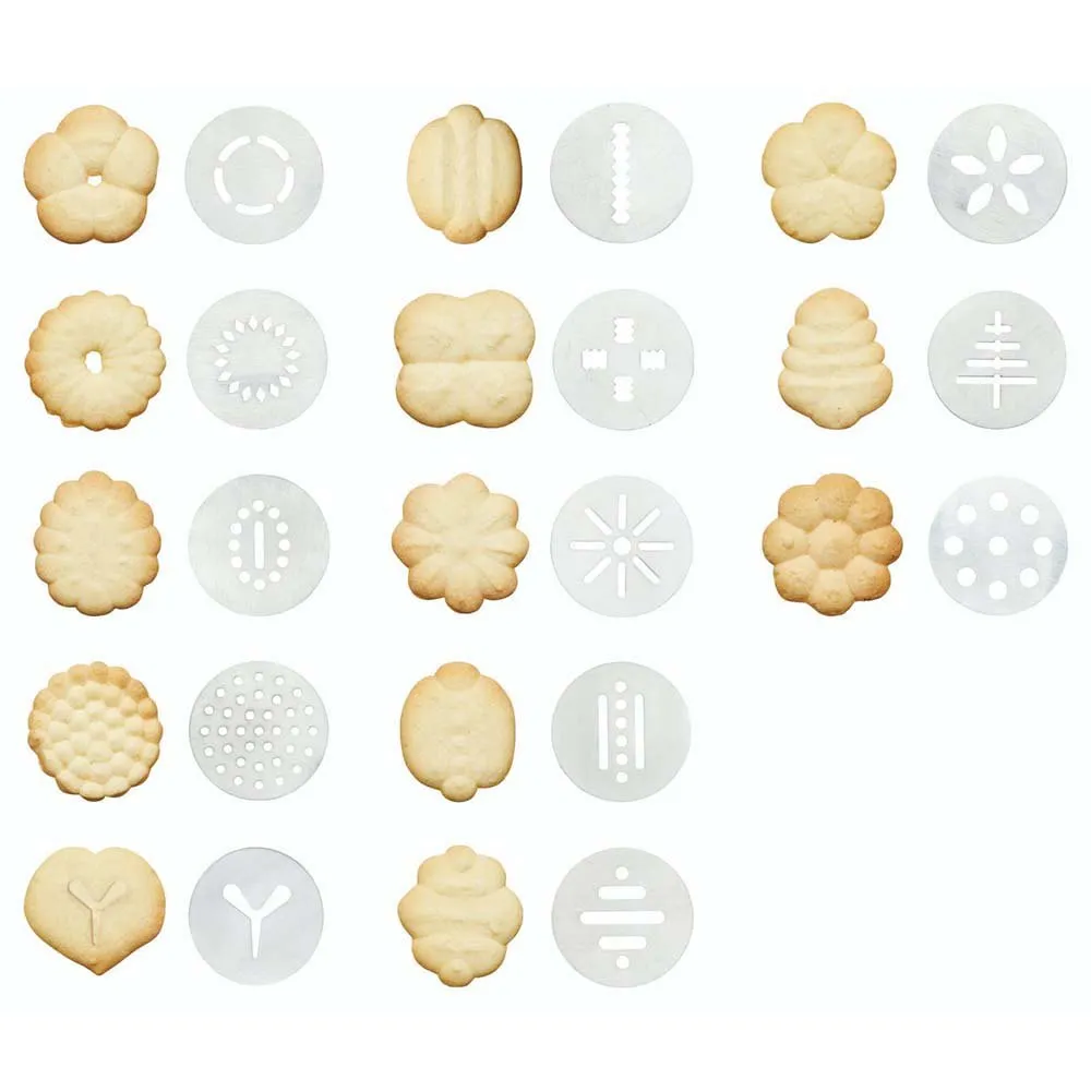 Så mye variasjon i ett sett! Dette 22-delte settet har åtte rustfrie stålsprøytedyser som enkelt festes på sprøytepistolen, slik at du kan velge blant en rekke former for å fryse og dekorere kakene dine.