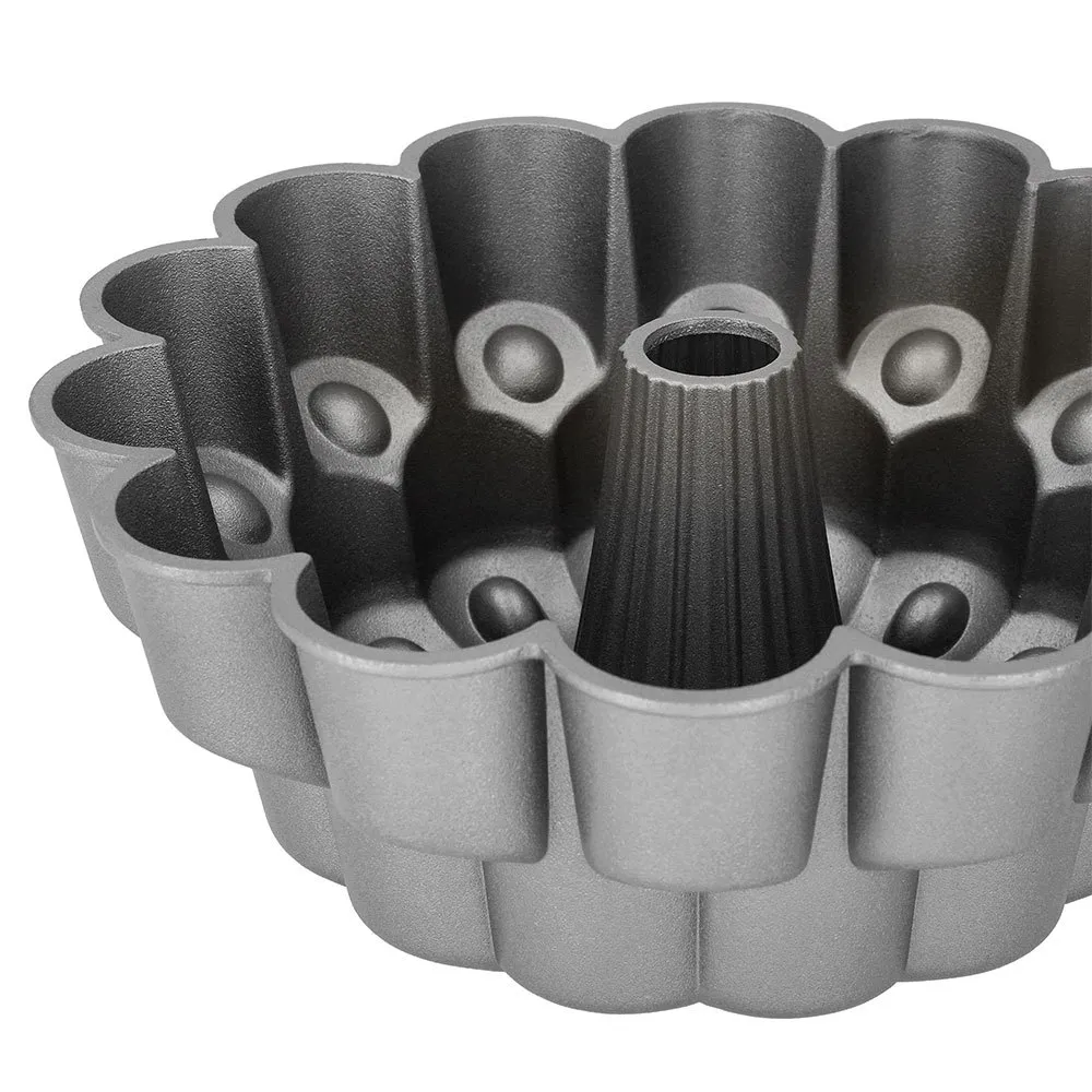 Ta forma do ciasta z nieprzywierającego odlewanego aluminium wyróżnia się wyrazistą sylwetką i jest idealnym połączeniem wysokiej jakości wykonania i przyciągających wzrok detali.