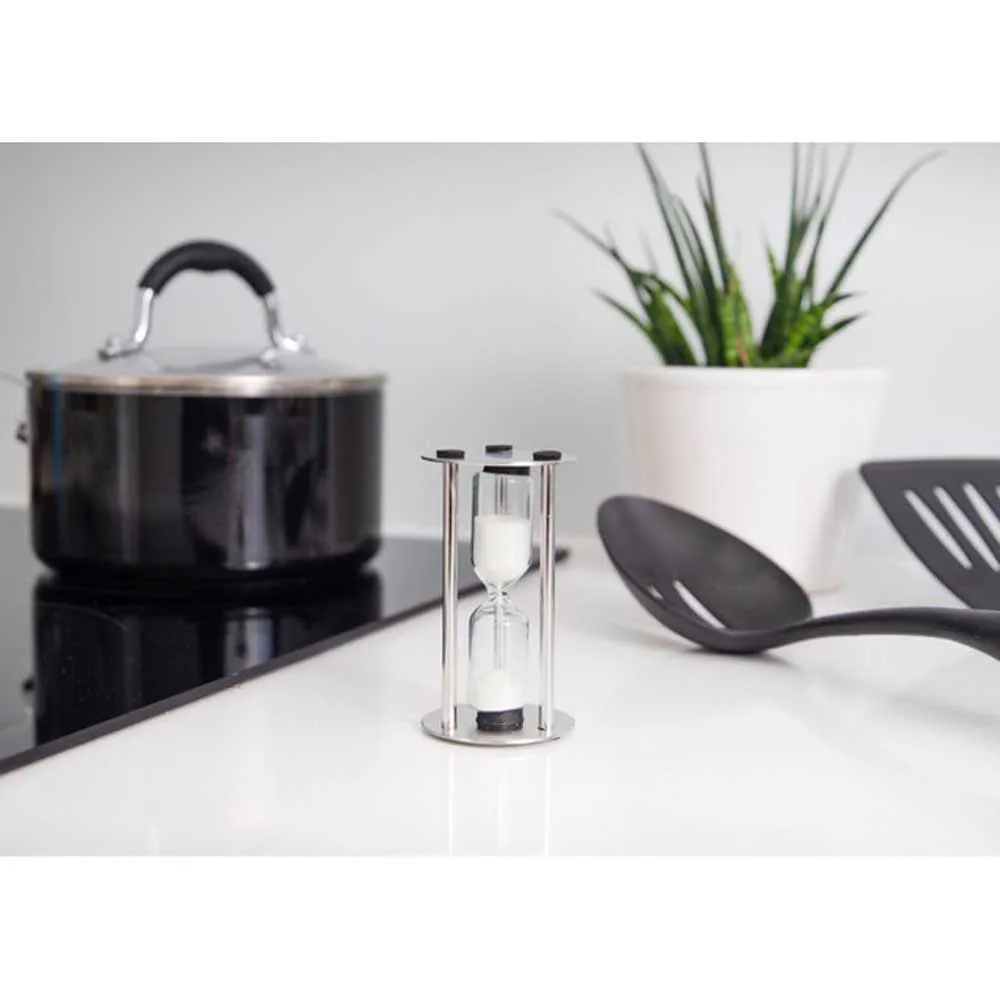 O temporizador de ampulheta de três minutos MasterClass é perfeito para quem gosta de estilo atraente e um bom café da manhã. Feito de aço inoxidável resistente com um belo acabamento acetinado, este temporizador de areia foi projetado para ser extra durável e ocupar um lugar de destaque em qualquer bancada de cozinha. Vire-o e observe sua areia branca fluir para a metade inferior, cronometrando exatamente três minutos. Esse é normalmente o tempo que leva para ferver o ovo cozido perfeito. Uma gema mole, torrada amanteigada crocante e um gadget de cozinha elegantemente descolado são os ingredientes certos para uma refeição matinal perfeita. Ele também vem protegido.