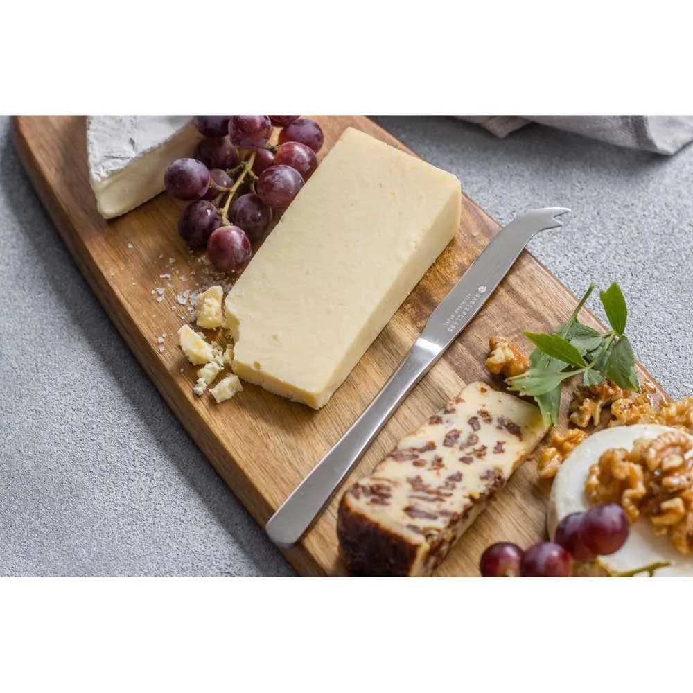 Com o Faca de Queijo em Aço Inoxidável MasterClass você pode facilmente cortar fatias de queijos duros e semi-duros como gruyère, gouda e cheddar. Sua construção em aço inoxidável de alta qualidade significa que é mais do que forte o suficiente para uso regular - por isso é ideal para verdadeiros aficionados por queijos. A faca possui uma borda serrilhada afiada, o que torna o corte de queijos direto da geladeira rápido e fácil. Quando você cortou uma fatia, você pode pegar com a parte superior de duas pontas da faca, para servir. Uma peça fantástica para se ter se você está hospedando uma festa de jantar, seu acabamento espelhado polido com certeza impressionará seus convidados durante seu curso de queijo formal. E, claro, é ótimo para lanches rápidos de queijo e biscoitos também.