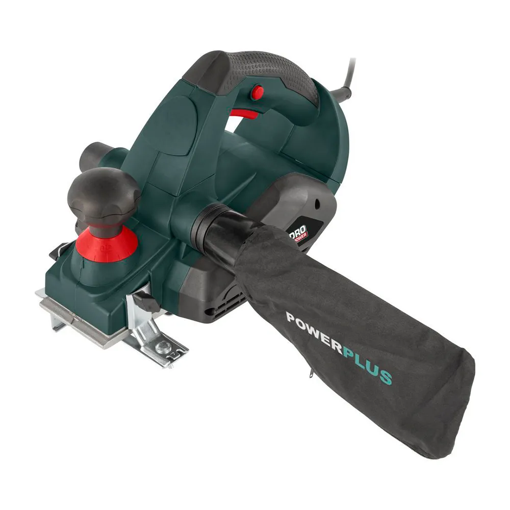 A plaina elétrica da Powerplus Pro Power oferece, com o seu motor de 910W, bastante potência para satisfazer as necessidades dos utilizadores profissionais mais exigentes. Possui um peso leve, uma largura de aplainamento de 82mm e uma profundidade de aplainamento ajustável de 3.5mm. A plaina tem uma capacidade de rebaixo de 12mm. A sua base metálica possui uma ranhura em V, ideal para fazer chanfros.