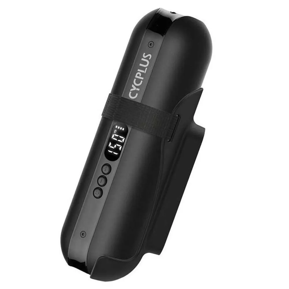Var beredd på alla eventualiteter. Cycplus A2 är en multifunktionell enhet som kan fungera som pump, powerbank och LED-ficklampa. Den är utrustad med ett kraftfullt uppladdningsbart batteri och erbjuder ett maximalt tryck på 150 psi. Den levereras också med ett munstycke för bollpump, ett cykelfäste och en bärväska.