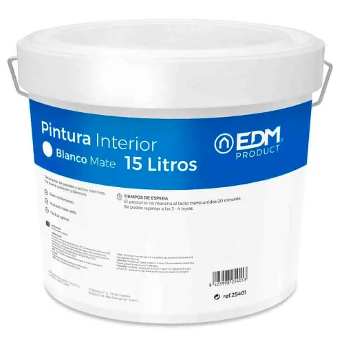 MAtt plastfärg vit inre 15l edm. silkesmatt väggfärg för dekoration av väggar och tak för inomhusbruk. bra täckning (1,67 1,69 g / ml) och vithet (bruguer vithetsindex 86 88), bra utbyte (7 9 m2 / l: 4 6 m2 / kg vid 50 torra mikra). silke matt finish för enkel applicering. applikationsmiljö: väggytor och arbeten. applicering med pensel, rulle eller pistol. Uttagstid: produkten berörs inte efter 20 minuter och kan målas efter 3 4 timmar. total torkning på 20 dagar. ljus 85 °. 14 18. opacitet 94 96%. finess 25 35 micra / fin. maximalt talinnehåll tillåter 30 g / l. max voc produktinnehåll 30g / l. normative compliant une en 13300.