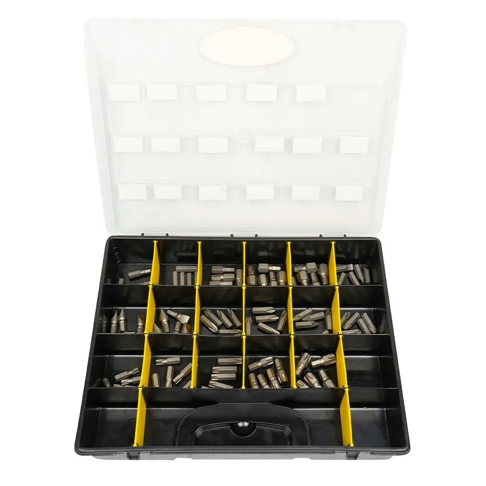 Robust och Portabelt Fodral: Inrymt i ett slitstarkt, slagtåligt plastfodral med en säker låsmekanism. Varje bitsposition är exakt gjuten och märkt för omedelbar identifiering och lagerhantering. Universell kompatibilitet: Alla bits har ett standard 1/4" sexkantsskaft, vilket säkerställer en perfekt passform med praktiskt taget alla borrmaskiner, elektriska skruvdragare, slagskruvdragare och manuella bitshållare.
