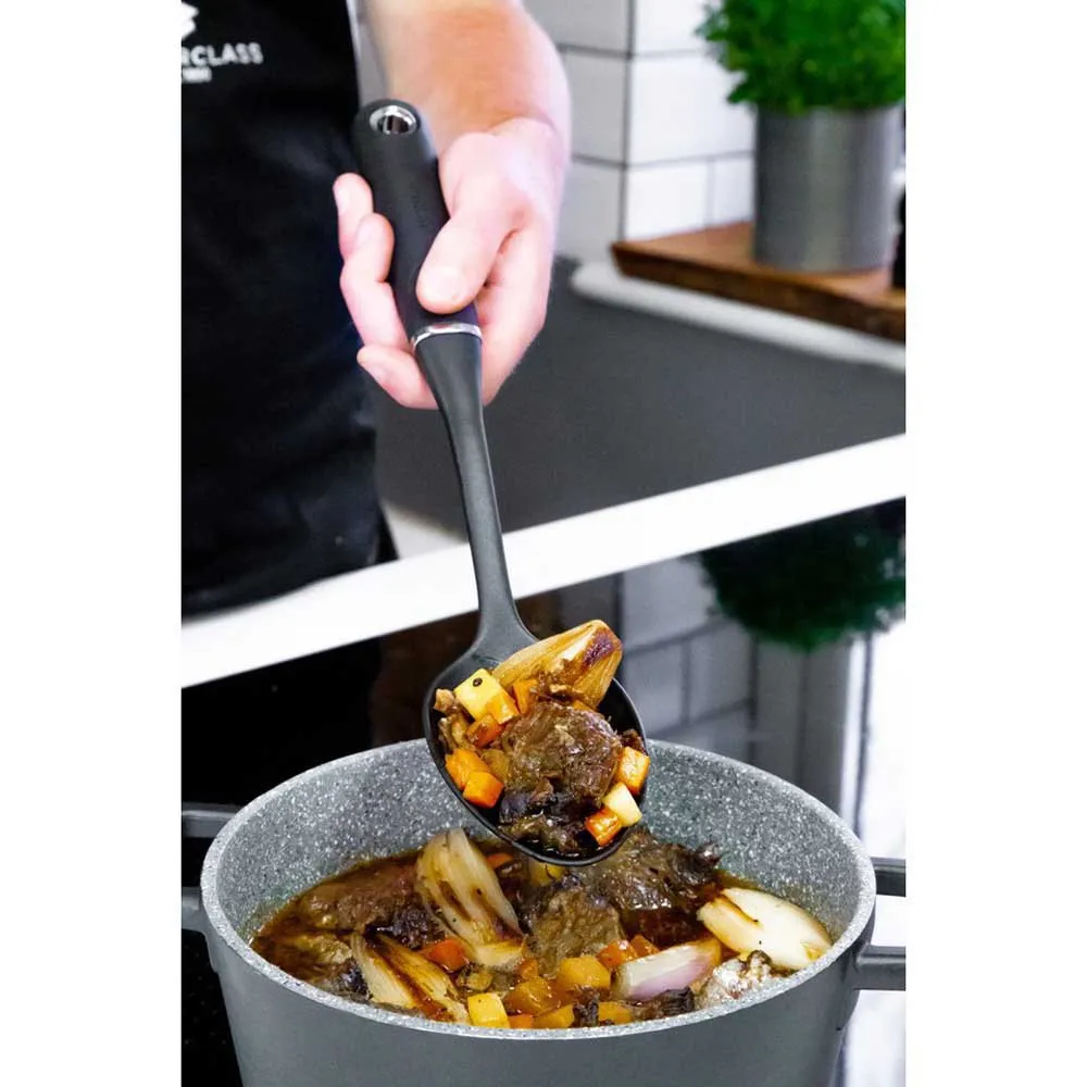 Köksskeden ger all mångsidighet, hållbarhet och komfort du kan förvänta dig av MasterClass, med den extra fördelen av slitstarkt nylon. Den är perfekt för att röra om, skopa och servera mat i köket eller vid matbordet. Och det är säkert att använda med vilken matlagningsyta som helst: nylon är tillräckligt tufft för daglig matlagning, men snällt mot non-stick-beläggningar. Denna premium kökssked har också MasterClass unika nylongrepp. Slät, bred och mjuk att ta på, den garanterar bekväm användning och halkfria resultat.