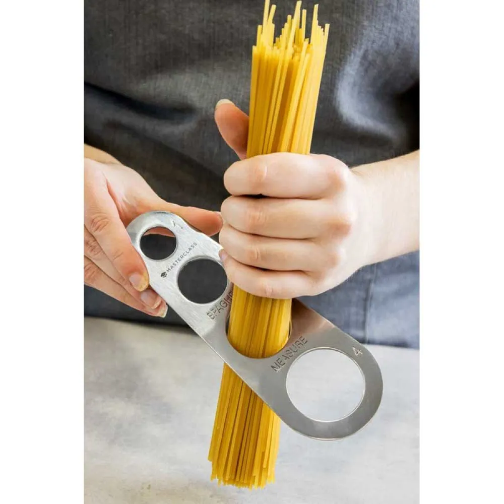 Spaghetti är en notoriskt knepig maträtt när det gäller att mäta portioner. Om du alltid lagar för mycket eller för lite, kommer du att älska MasterClass Spaghetti-mått i rostfritt stål. Det är en riktigt användbar kökspryl, och den kan till och med hjälpa dig att spara pengar och minska matsvinnet genom att få din spaghetti att räcka längre. Mäter upp till fyra vuxenportioner. Detta hållbara lilla verktyg är tillverkat av högkvalitativt polerat rostfritt stål och har fyra mätningshål. Dessa är utformade för att mäta en, två, tre eller fyra vuxenportioner, så det är verkligen användbart oavsett om du lagar ett mellanmål till en person eller en stor familjemåltid. Hålen är tydligt markerade för att visa portionsstorlekar. Snygg, robust och fläckbeständig. Med sin vackra polerade yta har detta pastamått ett klassiskt snyggt utseende som passar i alla kök. Och eftersom det är tillverkat av högkvalitativt rostfritt stål kommer det att hålla länge. Dessutom är det ett naturligt rostbeständigt material, så det är lätt att rengöra också. Användbar information - Tål maskindisk. Mäter 8 cm bred. Fem års garanti. Om MasterClass. MasterClass är dedikerade till att göra det exceptionella uppnåeligt varje dag. Den exklusiva köksserien innehåller mer än 600 lyxiga köksredskap, prylar, knivar och tillbehör, samt deras prisbelönta bakformsserier.