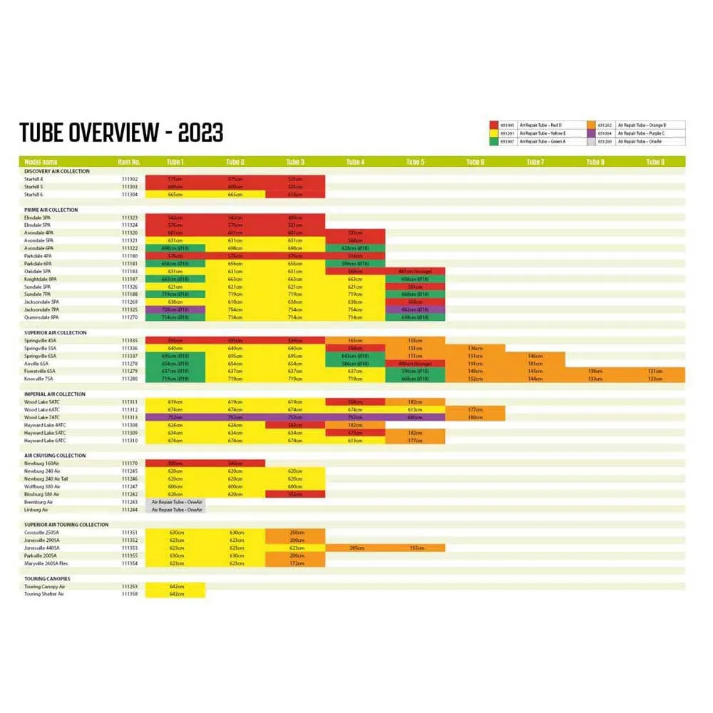Var och en är färgkodad för att hjälpa dig att identifiera den relevanta reparationssats som krävs för din tältmodell.