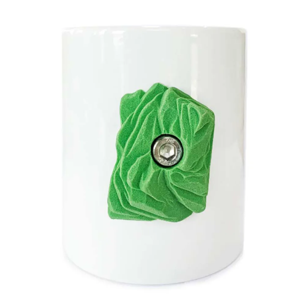 Med ett klättergrepp som handtag ger den ett utmanande grepp som stärker fingrarna medan du njuter av din favoritdryck.