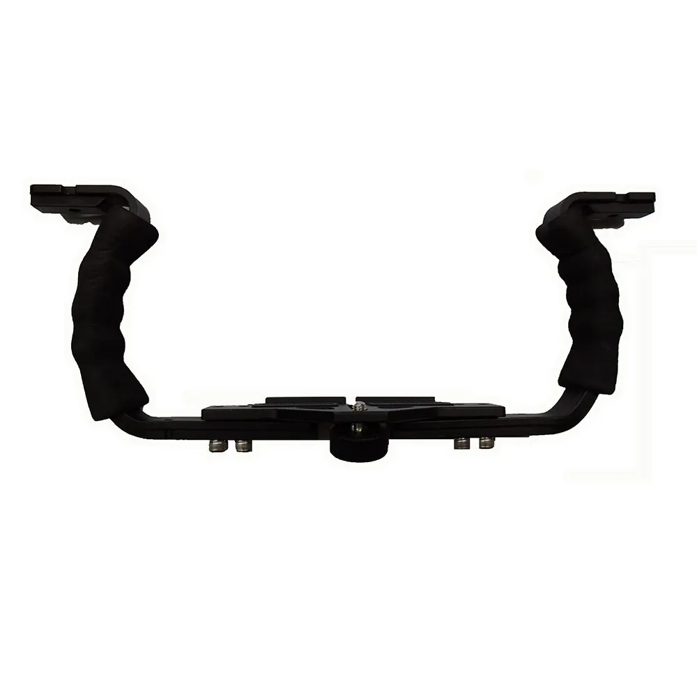 Gummibeschichtete Kamerabefestigungsbasis und Doppelschraube für jeden Arm. Es verwendet eine 1/4-Zoll Whitworth-Gewindeschraube, kompatibel mit den meisten Herstellern auf dem Markt (nicht gültig für GoPro).