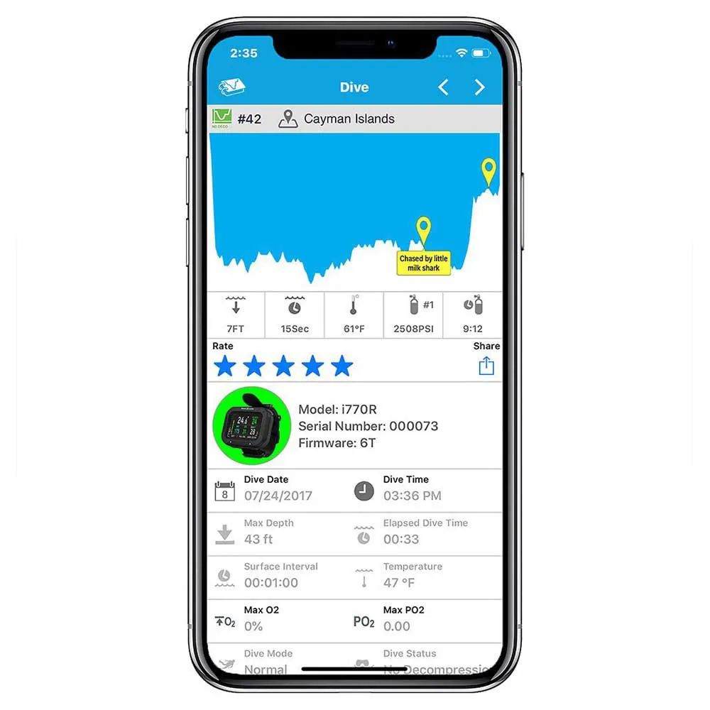 Steuern Sie alle Ihre i770R-Einstellungen. Sehen Sie sich Log- und Profildaten an, fügen Sie Orte, Notizen sowie andere Details hinzu. Speichern und teilen Sie Fotos und Videos Ihrer Tauchgänge.