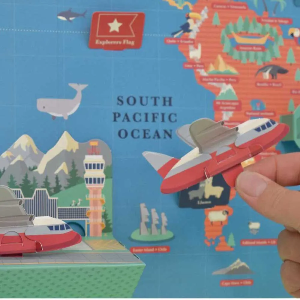 TErkunden Sie den Globus, indem Sie eine riesige interaktive Weltkarte mit 3D-Kompass, Flugzeugen, Schiffen, herausspringenden Sehenswürdigkeiten und vielen lustigen Aktivitäten erstellen.