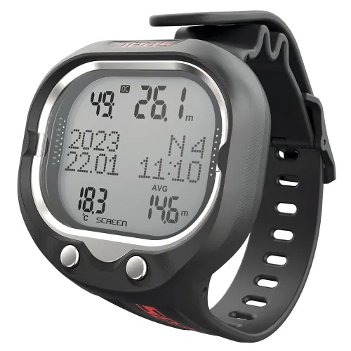 Erleben Sie müheloses Tauchen mit dem SEAC Screen Tauchcomputer. Sein großes, kontrastreiches Display zeigt alle wichtigen Daten in einer klaren Ansicht, selbst bei einem schnellen Blick. Vielseitig für jedes Abenteuer, bietet er spezielle Scuba-, Gauge- und Freedive-Modi. Im Scuba-Modus verwalten Sie ein oder zwei Gasmischungen (Luft/Nitrox) und verlassen sich auf akustische und visuelle Alarme für Ihre Sicherheit. Apnoetaucher können Tauchzeiten und Tiefen mit Leichtigkeit verfolgen. Das benutzerfreundliche Design umfasst zwei große Tasten zur Bedienung mit dicken Handschuhen und ein langes Armband, perfekt für Trockentauchanzüge. Protokollieren Sie bis zu 40 Stunden Ihrer Unterwassererkundungen