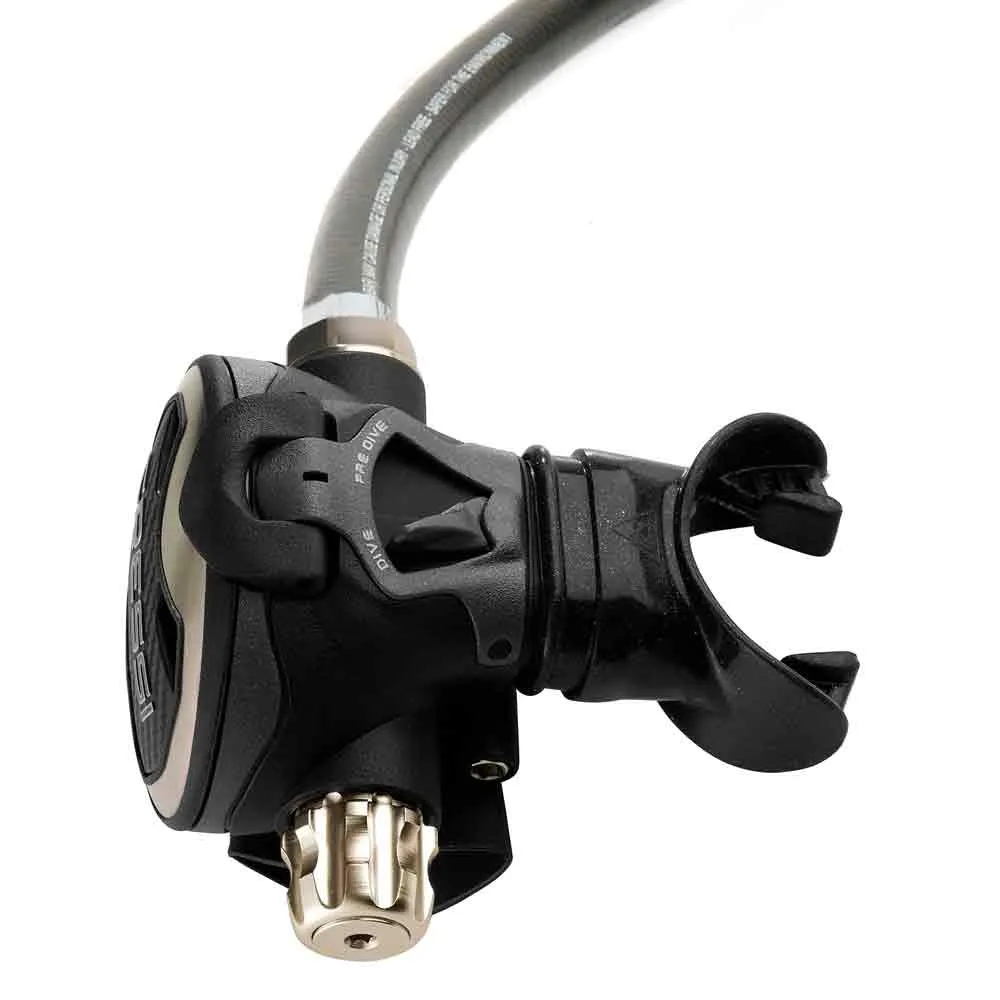 It is combined with the Master Cromo, the pneumatic balanced 2nd stage that features an elliptical shape and a lateral knob for Venturi adjustment. The stages are connected with the Cressi Safeflex LP Hose, a better performance hose compare to the standard one. The AC25m/Master Cromo is available in DIN and INT version.